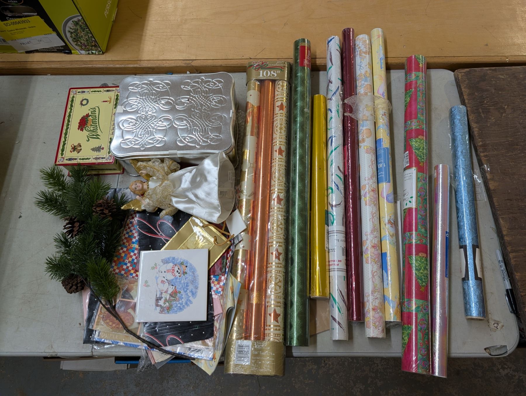 Unique Christmas tree decorations + metal Christmas box + mostly Christmas wrapping paper.