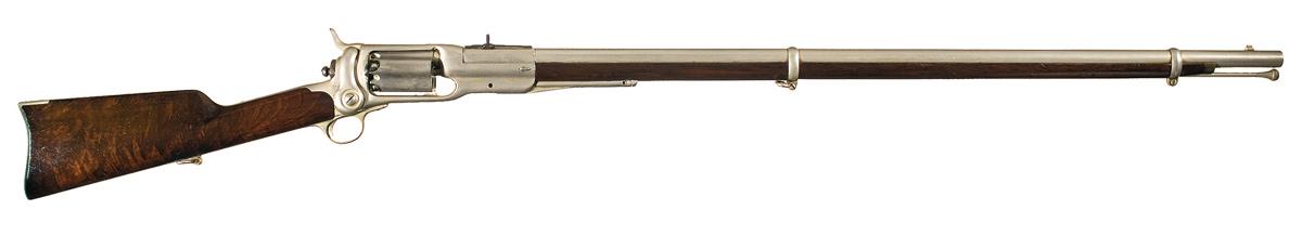 This Colt Model 1855 Military Rifle was made with five-shot fluted cylinder and 37 1/2-inch round barrel with semi-octagonal section at the breech. Colt manufactured 8,075 .56 caliber Military Rifles; 4, 825 of these rifles had the long, 37 1/2-inch barrel. The rifle has a period tin-plated finish with blued, three-leaf, rear sight and walnut stock and forearm. The rifle front sight serves as a lug for a socket bayonet. The rear sight leaves are calibrated for 100, 300 and 600 yards. The buttplate has a sliding trap for a cleaning rod extension. The top strap is roll-stamped: "COL. COLT HARTFORD CT. U.S.A.". "PATENTED SEPT. 10th 1850" is stamped in one cylinder flute. "COLT'S PATENT/Nov. 24th 1857" is stamped on the left side of the frame above the side plate. The serial number, "4164" is visible on the lower receiver tang, the bottom of the frame and on the heel of the buttplate. All of the visible serial numbers match. Several Federal regiments were armed with Colt Model 1855 Revolving Rifles during the Civil War.