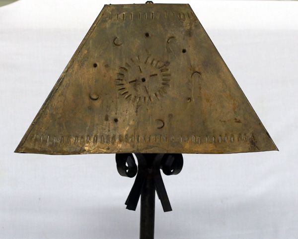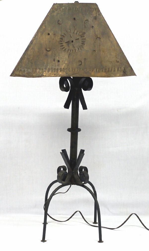 Unique Copper Lamp and Copper Lamp Shade. This Unusual Lamp had a punched design in the shade of the sun and half moons and stands approx. 31''H. The shade itself is 9''H x 15'' x 15''.
