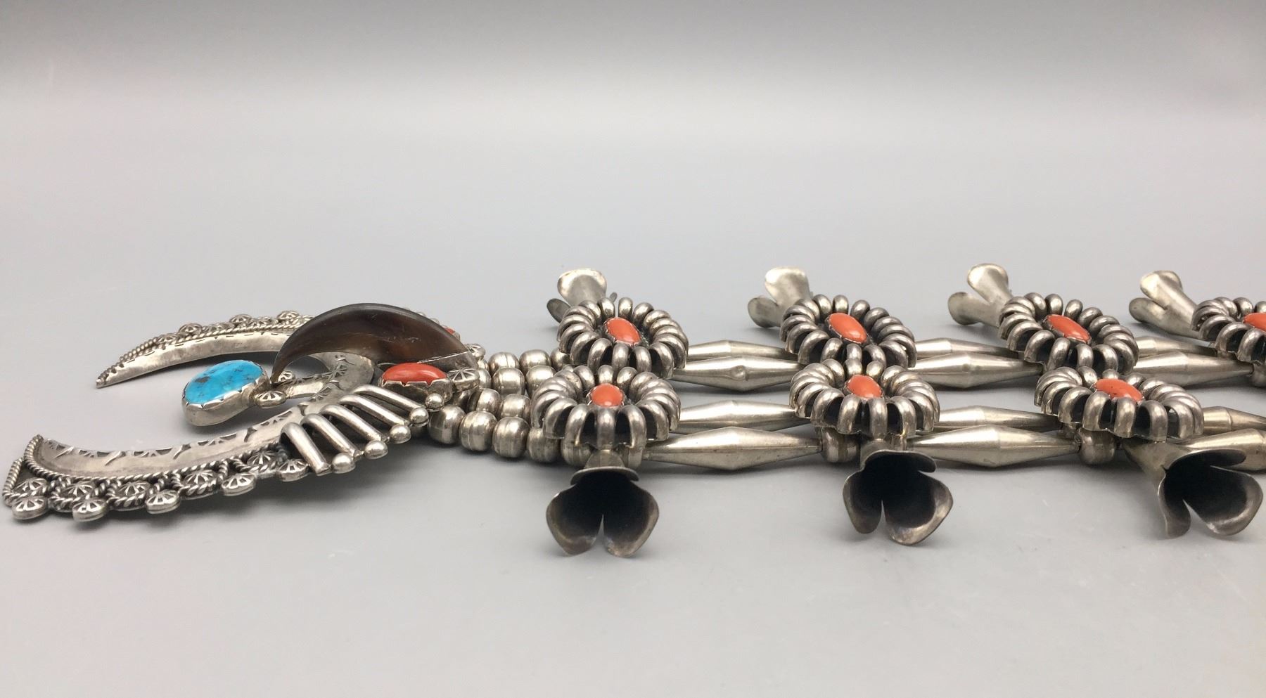 Description: A unique looking, statement piece kind of necklace with coral and turquoise and a claw! This squash blossom necklace was tested as sterling silver. Maker: Hallmarked with what looks like back to back JJ and a symbol, the exact maker is unknown to us. Approx. Age: Circa 1980s or newer. Size: Fits a 24” neck. Pendant measures 3-5/8”w x 3-1/4”h. Weighs 290.8 grams. Condition: Good for its age, normal wear expected. Please look closely at the pictures - they are an important part of our description. Shipping: There will be a $5 handling / packaging fee for shipping this lot. The actual cost of postage will be added on top of that.