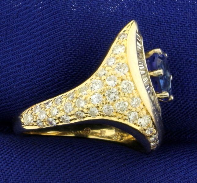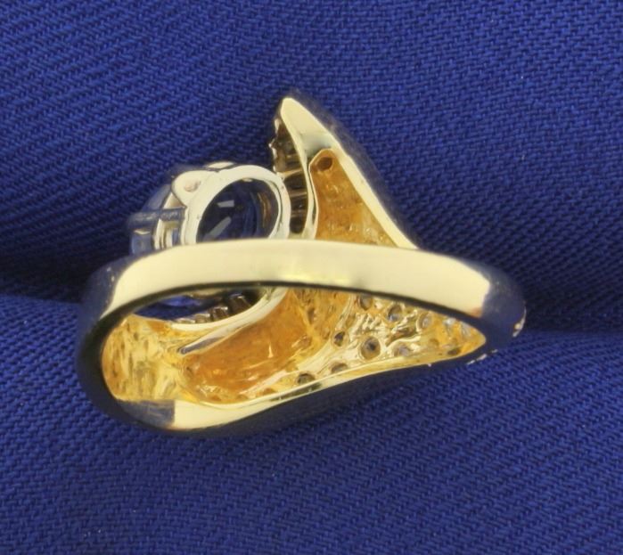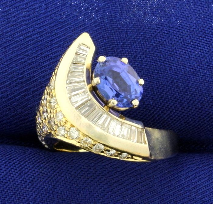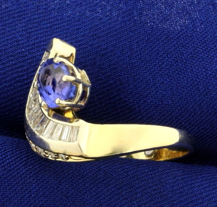 In 14K Yellow and White Gold. Contains a natural 8x6mm oval cut Tanzanite gemstone with bright purple color and excellent clarity. Also contains 1 ct TW of high quality round and baguette diamonds, SI clarity/H color. 7.3g