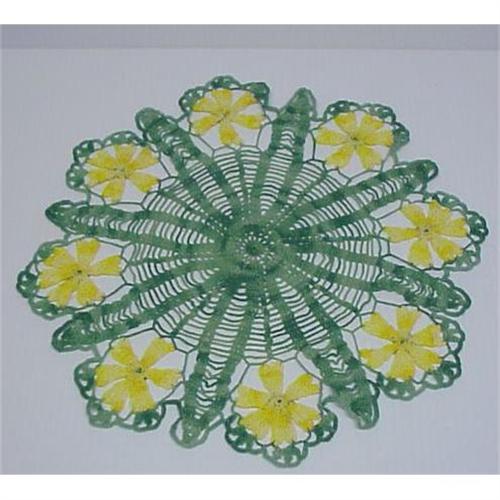 Gorgeous Antique crocheted round center piece made in Arts & Crafts style, Love the beautiful figural yellow blossoms against the fresh lovely green background - Very fine condition free of holes - Measures 13" in diam., US Buyer to pay 3.00 for insured shipping - We prefer Paypal payments - Thank You very much for looking!