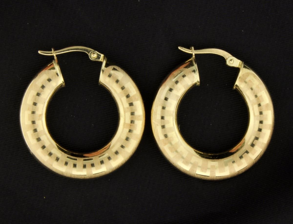 In 14k yellow gold these earrings are 1 1/4inch long with a unique design etched in the side.     3.7g