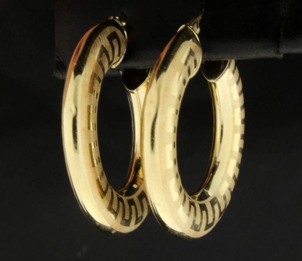 In 14k yellow gold these earrings are 1 1/4inch long with a unique design etched in the side. 3.7g