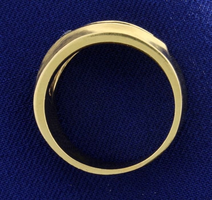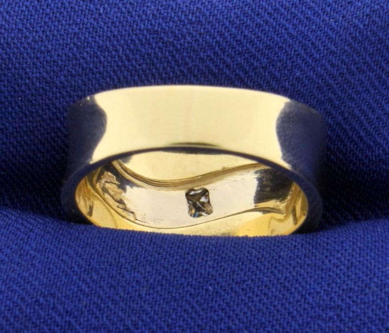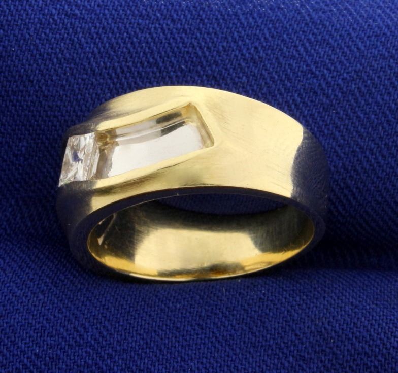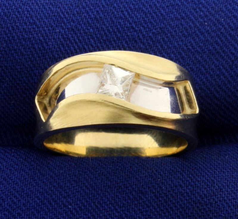 In 14k yellow and white gold. Contains a high quality 1/3ct princess cut diamond, VVS clarity/H color. Size 7 1/2. 7.5g.