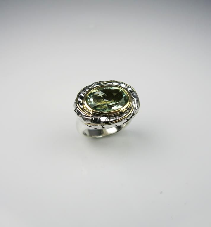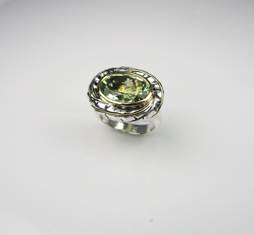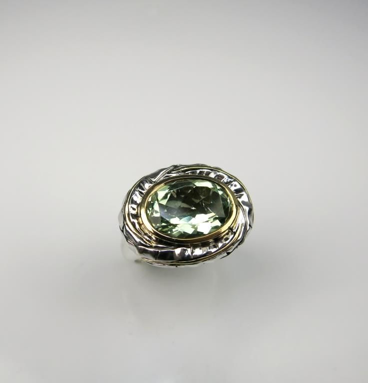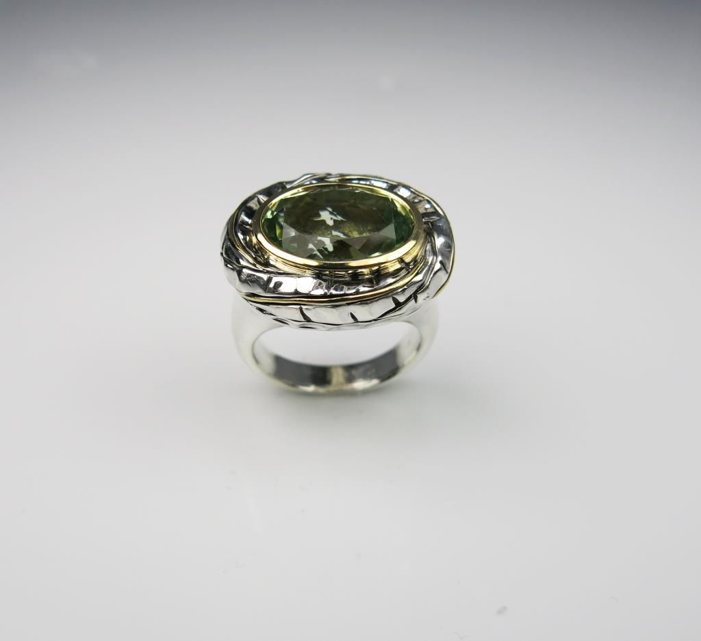 Unique Designer Green Quartz Ring with Tropical Leaf Motif very well made (looks like DAVID YURMAN) in Sterling Silver with yellow gold accents. Retail $1,000-$1,500 Estimate $600-$900
