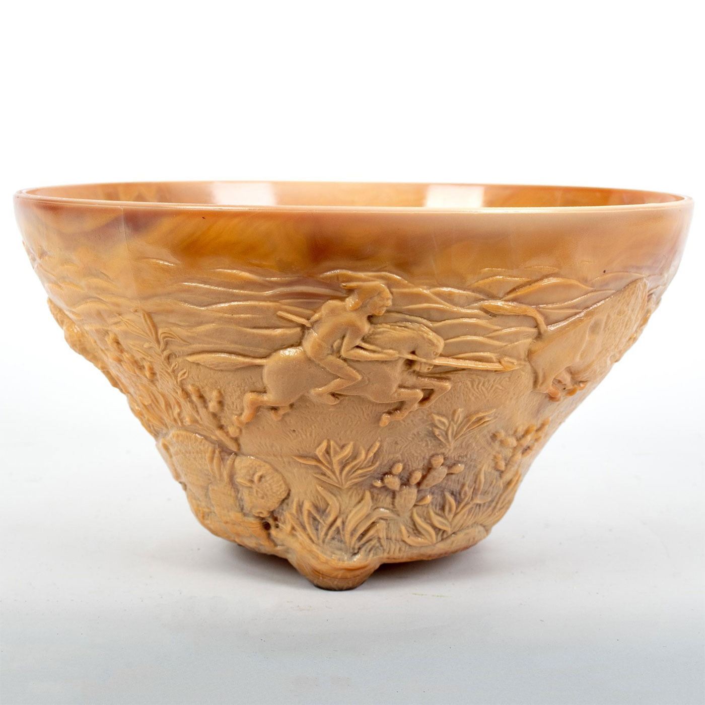 Highly detailed in relief bowl featuring Native American and buffalo scene.