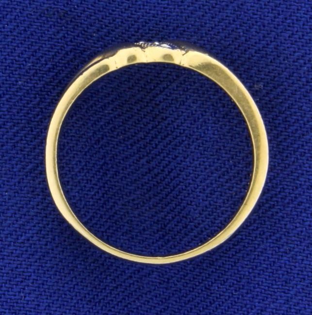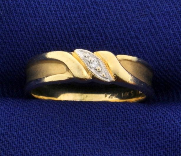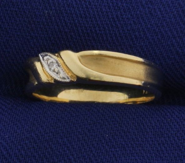 14k yellow gold diamond band. The band is 4.25mm across the top and tapers to 3mm. Contains a high quality .02 ct diamond, SI clarity/H color. Size 5. 2.5g.