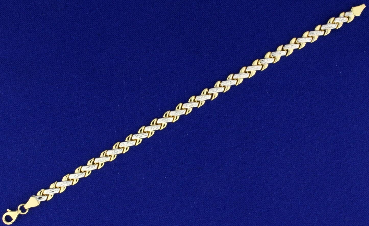 In 14k yellow and white gold. 5.5mm wide, with lobster clasp. 4.9g.