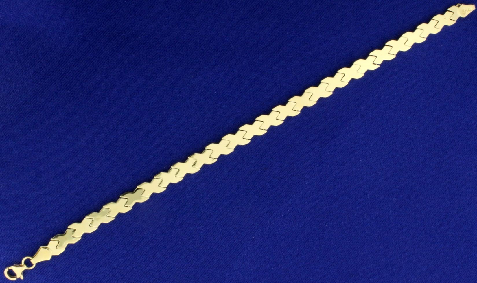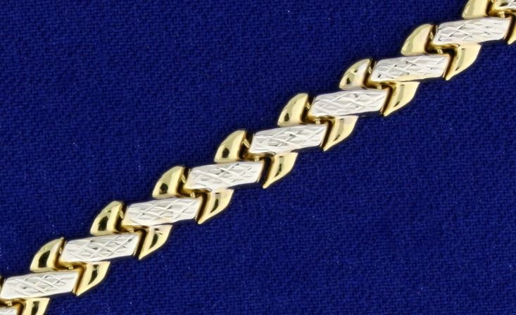 In 14k yellow and white gold. 5.5mm wide, with lobster clasp. 4.9g.