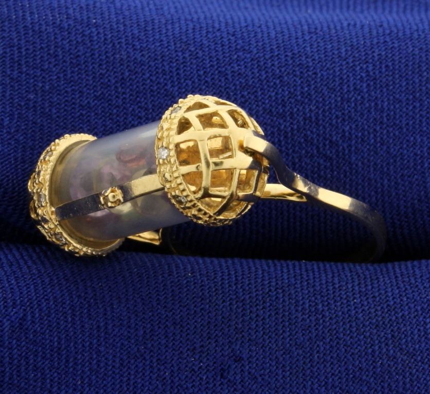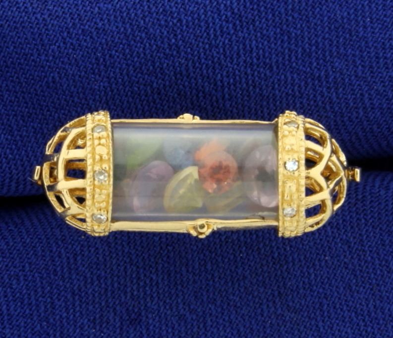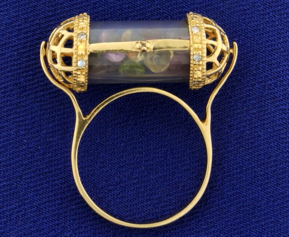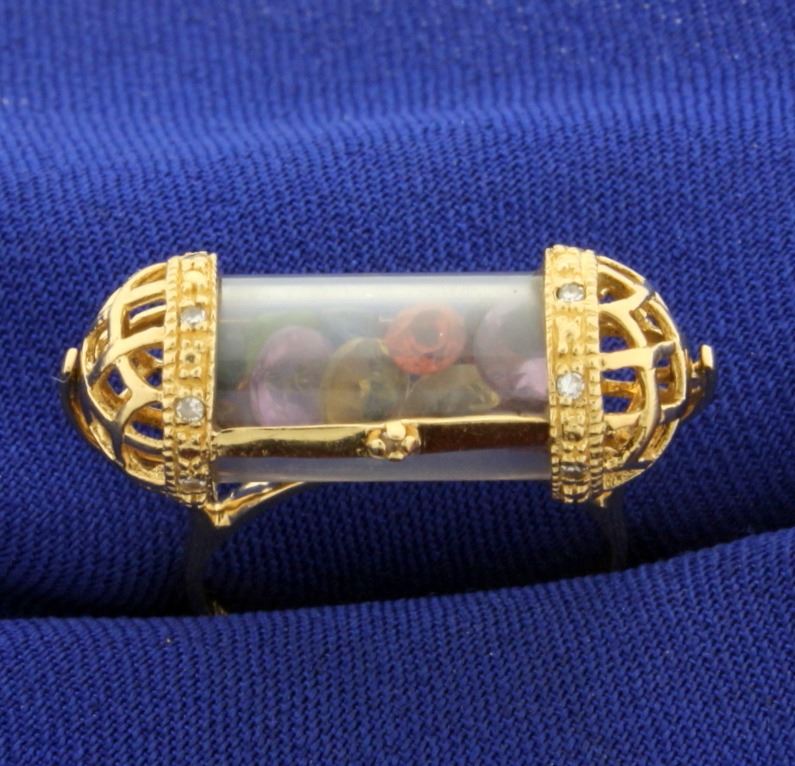 In 10k yellow gold. Rotating cylinder contains a variety of gemstones such as amethyst, peridot, topaz, and garnet. Also contains sixteen half point diamonds surrounding cylinder. Size 6. 3.5g.