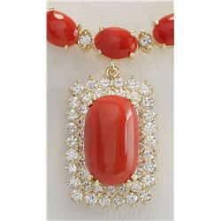 47.41CTW Natural Red Coral And Diamond Necklace In 14K Yellow Gold