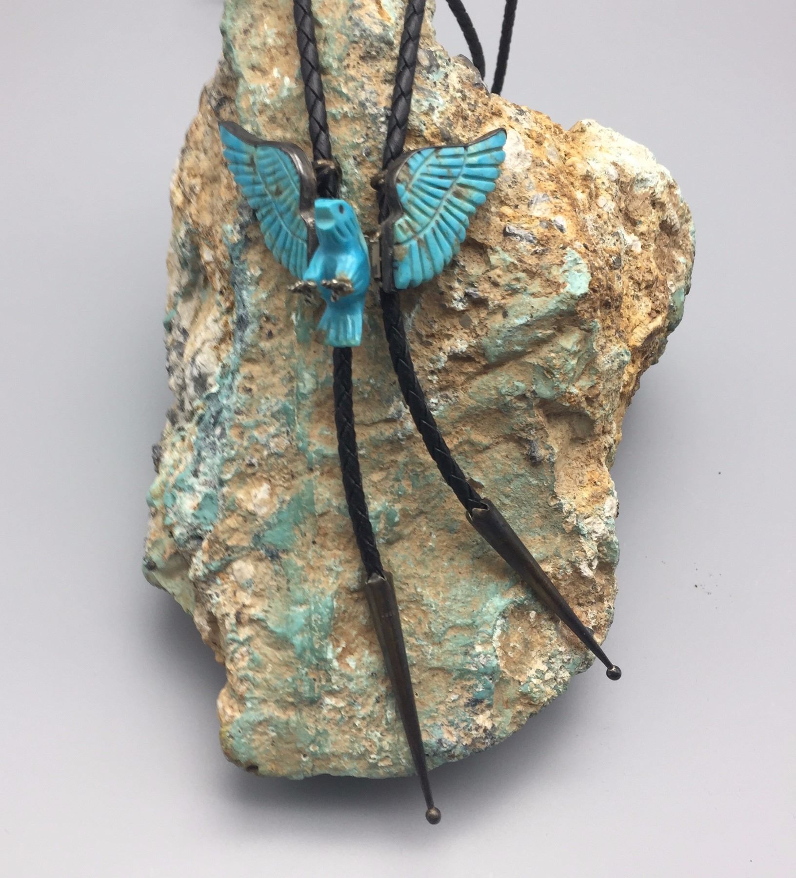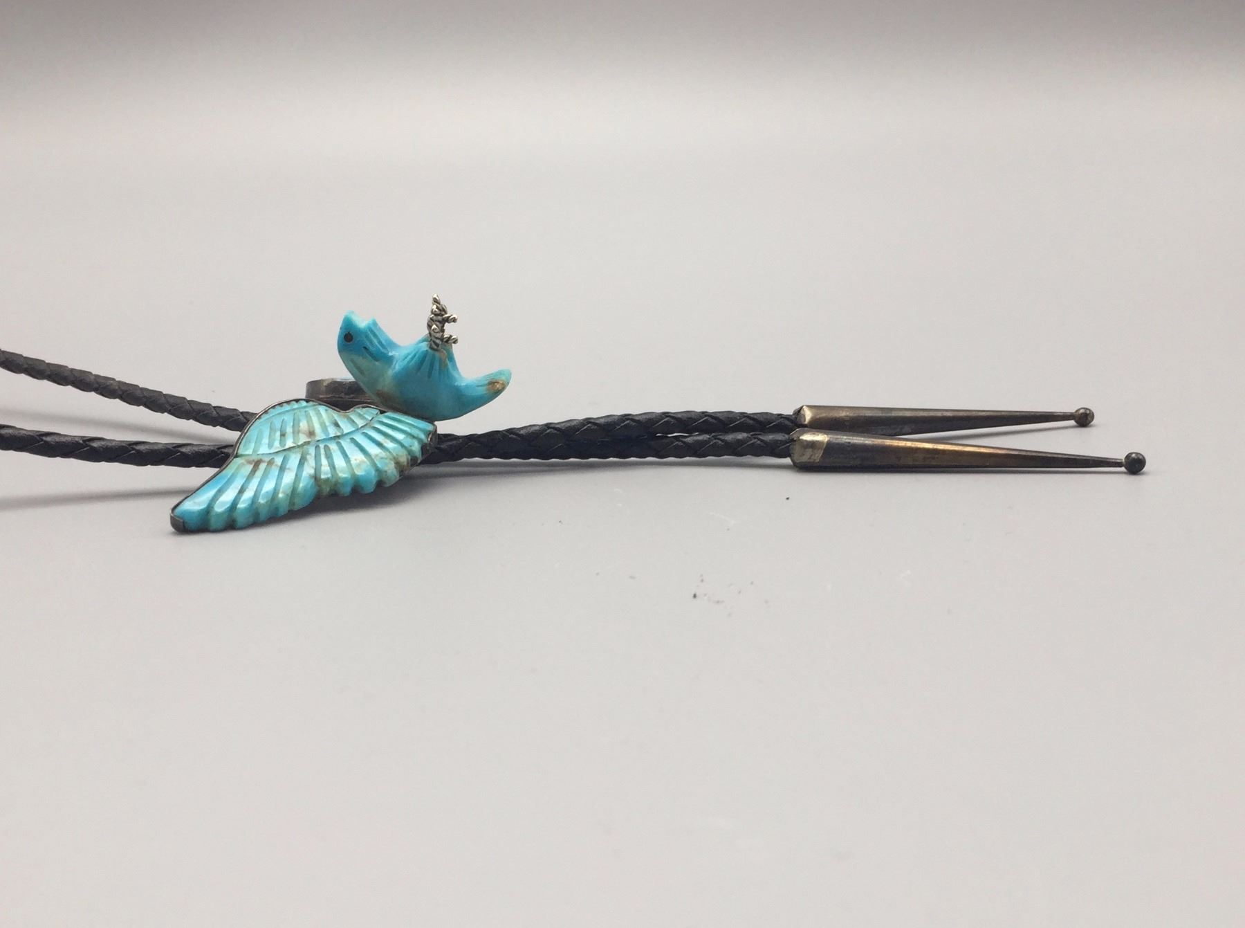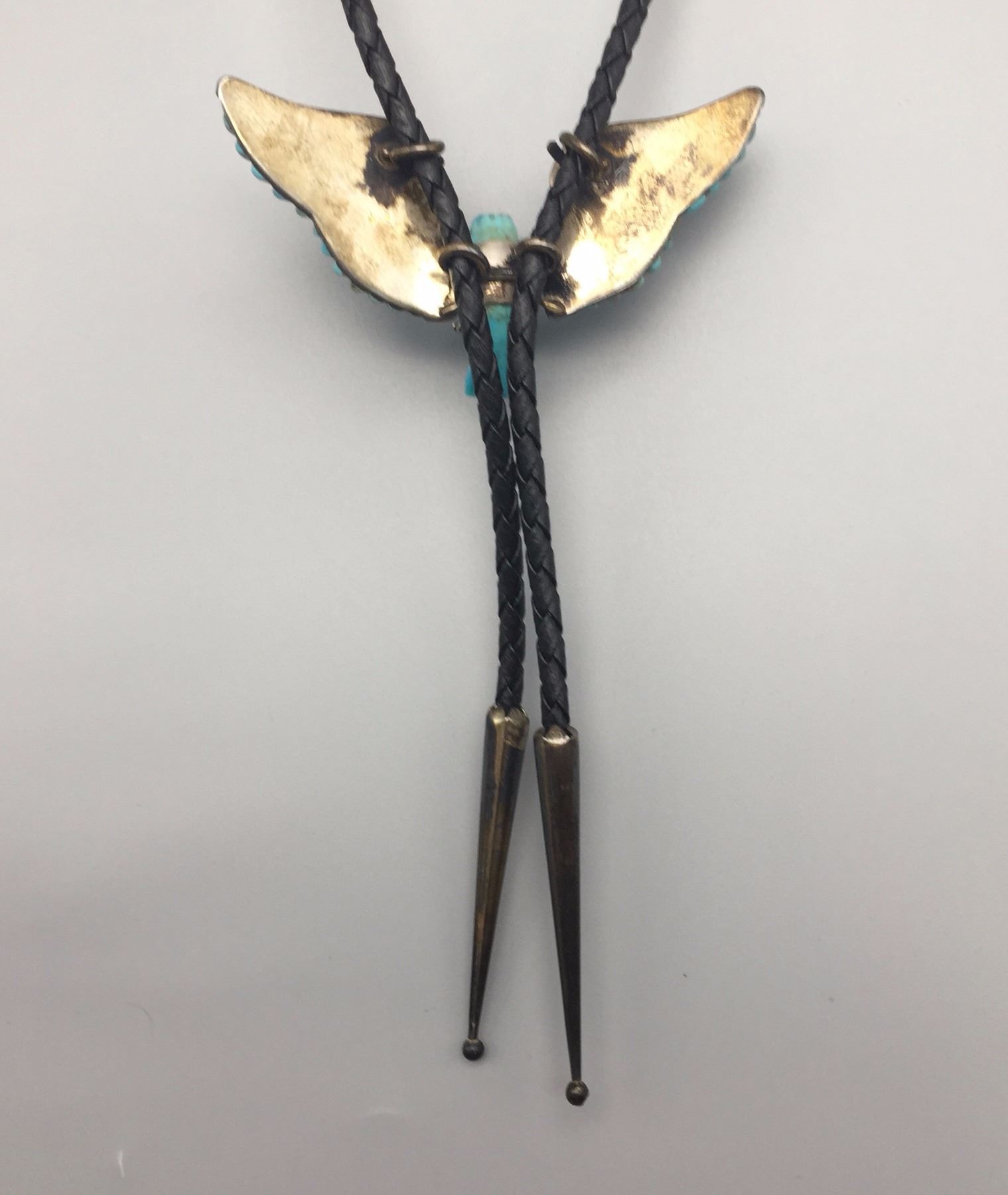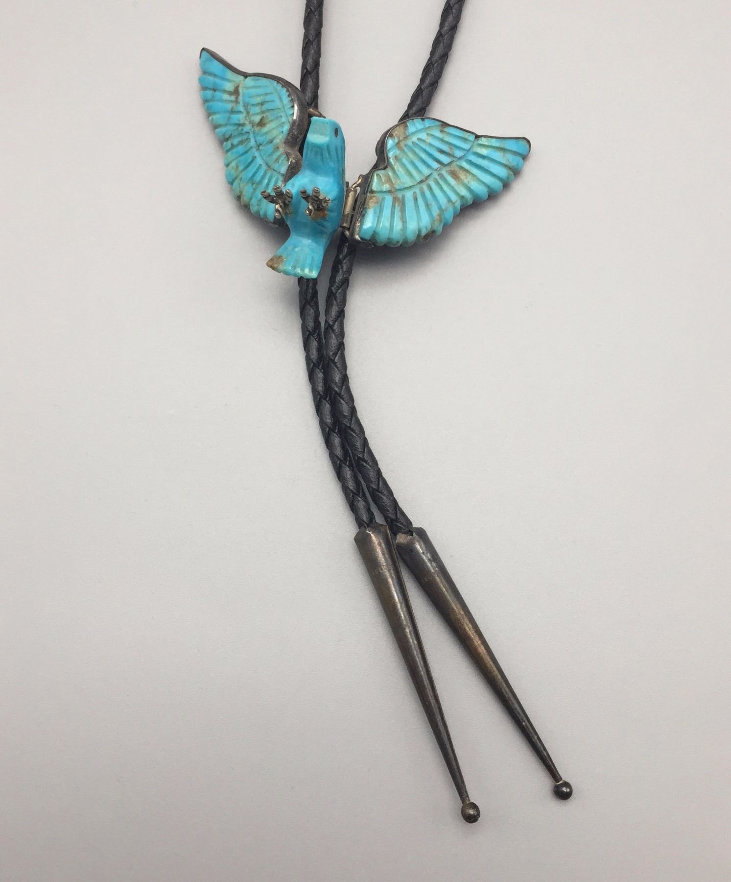 Maker: Most likely Navajo. Approx. Age: Vintage. Size: Slide measures approx. 3” x 2”, cord is 40” overall. Weighs 33.0 g. Additional Info: Nice hand carved turquoise and sterling silver eagle bolo on a braided black cord with sterling tips. Condition: Good, normal wear expected. Please look closely at the pictures - they are an important part of our description. Shipping: There will be a $5 handling / packaging fee for shipping this lot. The actual cost of postage will be added on top of that.