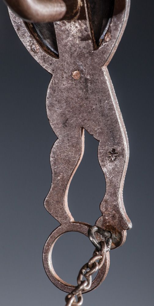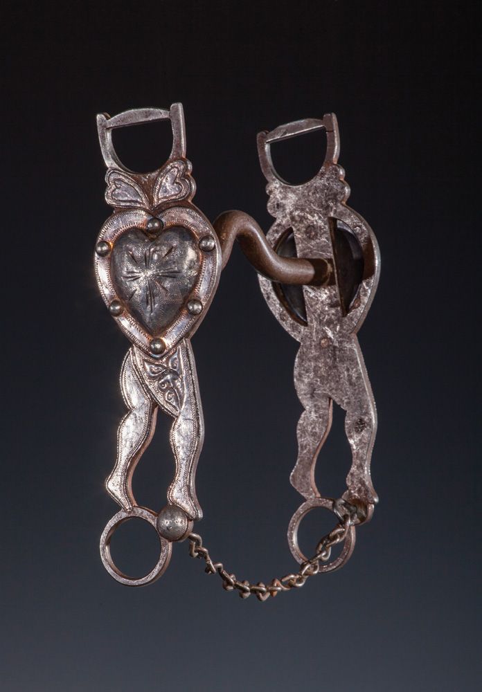Unique Eduardo Grijalva Bit. Unusual, lovely and whimsical "E.G.*" maker-marked "walking" lady-leg curb bit with raised hearts and slobber chain. Excellent condition, circa 1960s. PROVENANCE: Dick Powell Collection, Casa Grande, Arizona