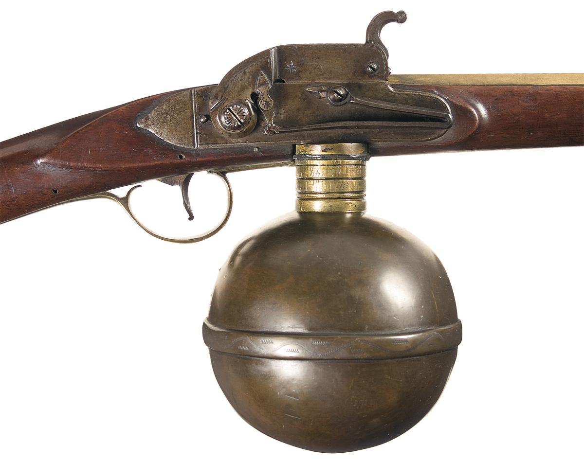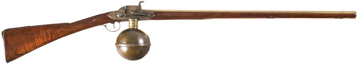 In many ways ahead of their time, the black powder era saw the development of several weapons that used compressed air in place of combustible powder to drive the ball, the most famous being the Austrian Girandoni repeater taken on the Lewis & Clark expedition. Blade and groove sights on the brass barrel. Attached to the underside of the lock is a brass gas chamber, measuring 14 3/4 in circumference around the engraved center band, with a percussion-style hammer arrangement to strike the valve release. Smooth full length straight grip stock, with ramrod, brass trigger guard and a lightly engraved brass buttplate. As for this specimen, writer believes it to be of English origin, from the early 1800s. The form of the stock, shape of the furniture and brass barrel all lead up to that conclusion.