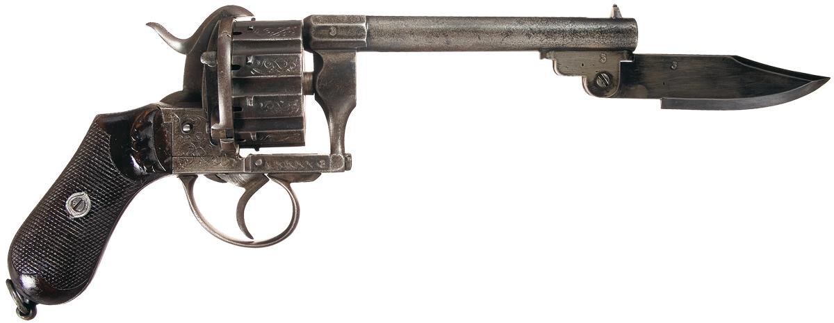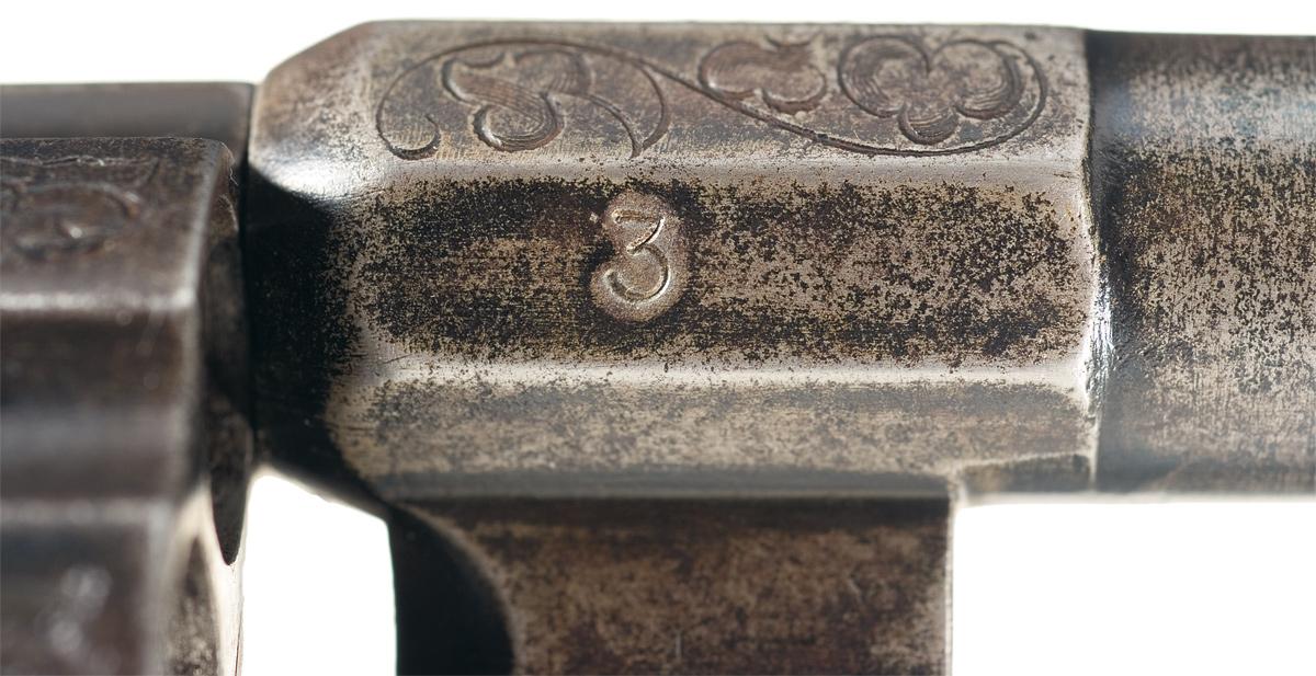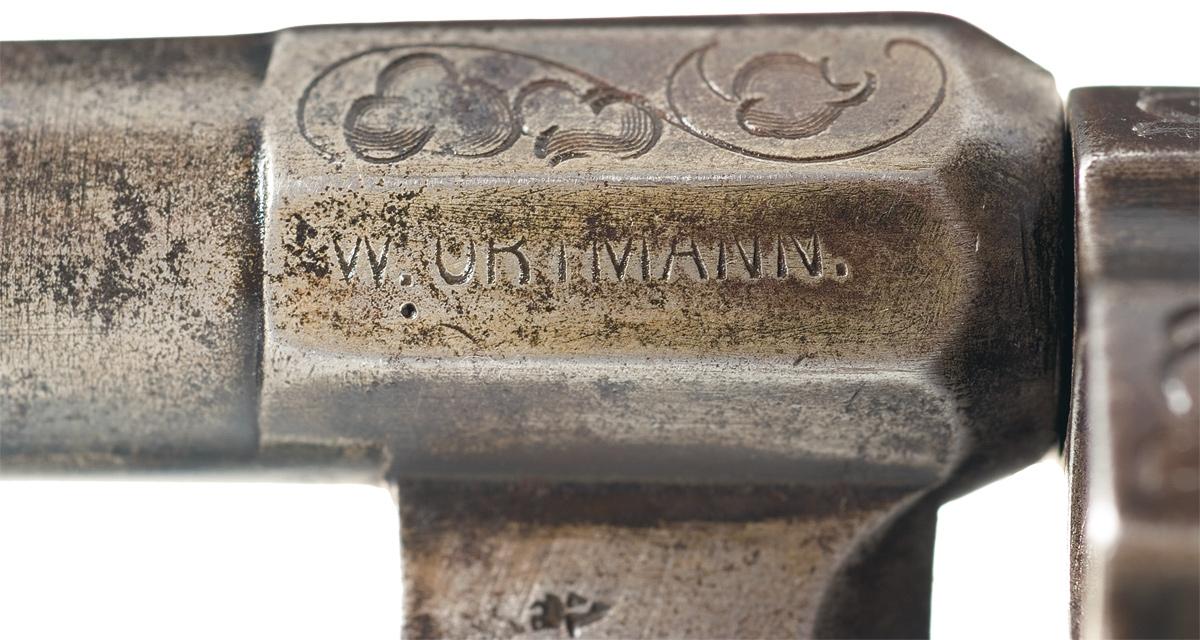 Raised bead front and hammer groove rear sights, with scroll engraving on the breech, "W. ORTMANN" on the left side, and matching numbers on the breech, blade lug and blade. The blade is Bowie-style, 4" long with a 1 7/8" long back clip. Matching numbers are also present on the frame and cylinder, with scroll designs on the cylinder between the flues and vine work on the frame. Additional engraving is also present on the backstrap and trigger guard. Checkered bag shaped grips, with raised floral designs near the frame and a lanyard ring on the butt. With notes from the consignor.