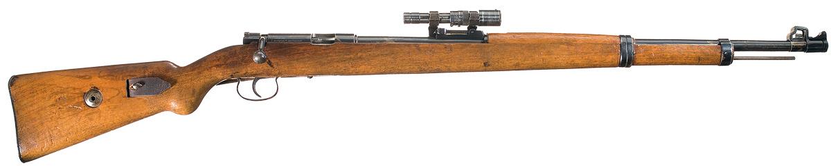 Condition: Very fine, with 85% of the original blue finish, showing patches of brown and gray patina on the barrel and scattered handling marks. Stock is fine, with numerous scratches and dents. Optics are hazy. Mechanically excellent.