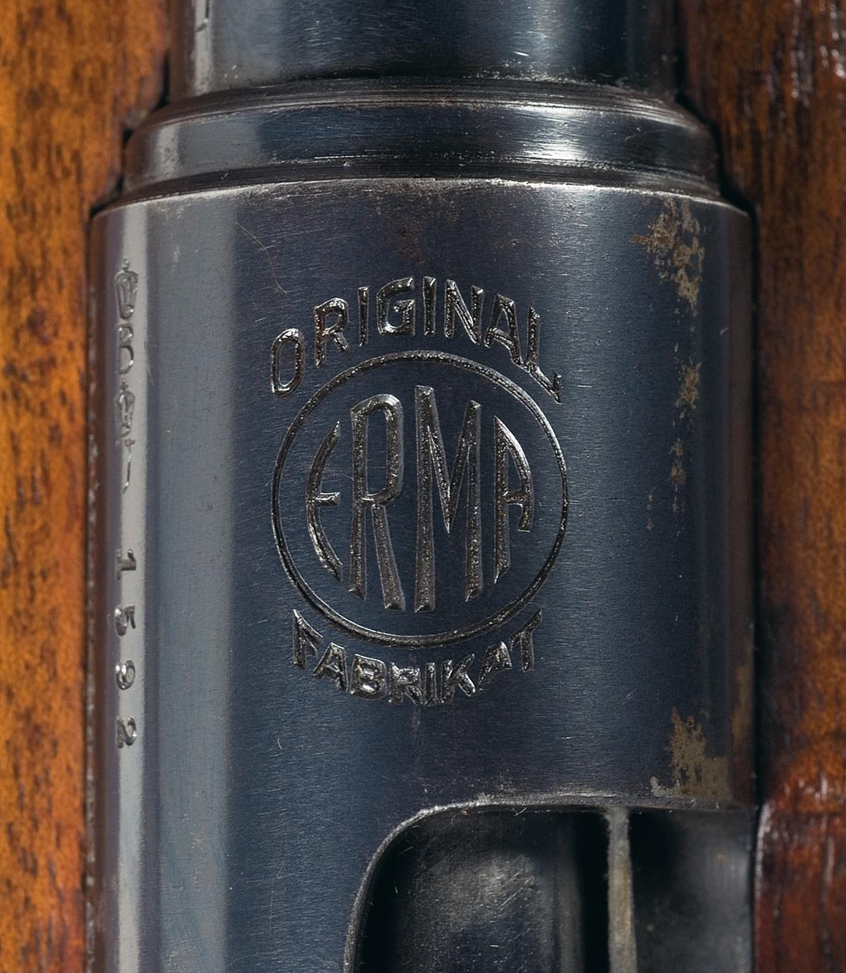Blade and tangent sights, with caliber marking on the barrel, "crown/ letter" proofs, Erma symbol on the chamber and "Deutsches Sportmodell" on the right side of the receiver. An unmarked scope base has been added, with a "duv" (Lubecker) mount and "cxn/ 81880" marked ZF-41 scope. Smooth straight grip stock, with a flat buttplate and a brown leather sling.