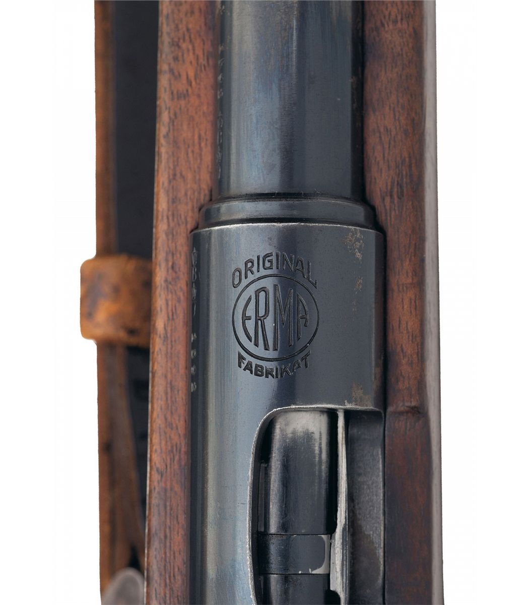 The rifle is equipped with blade and tangent sights. A scope rail is present on the left side of the barrel next to the rear sight. The scope rail has a "duv" (Lubecker) marked mount and holds a ZF-41 scope. This scope is marked "cxn/81880". There are "crown/letter" proofs present with the caliber marking on the barrel. The chamber is stamped with the "Erma" symbol and the right side of the receiver is stamped "Deutsches Sportmodell". Mounted with a smooth stock fitted with a flat steel buttplate. The rifle has a brown leather sling.