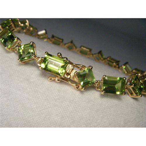 You are looking at an estate 14K yellow gold peridot tennis bracelet. This unique piece features 10 square and 10 rectangular natural peridots. The bracelet measures 7 & 1/8 inches long by 5/16 of an inch wide. It weighs 11.2 grams. It is in mint condition.
