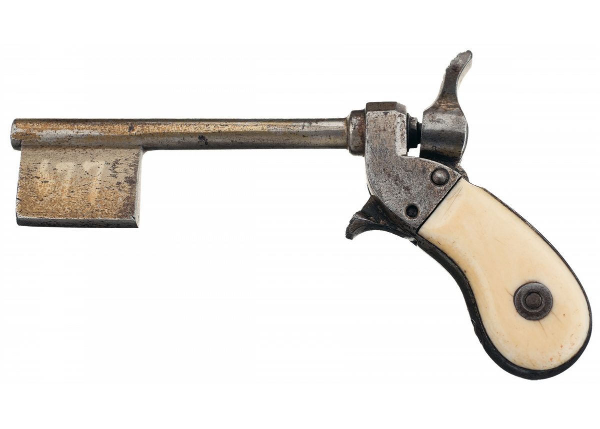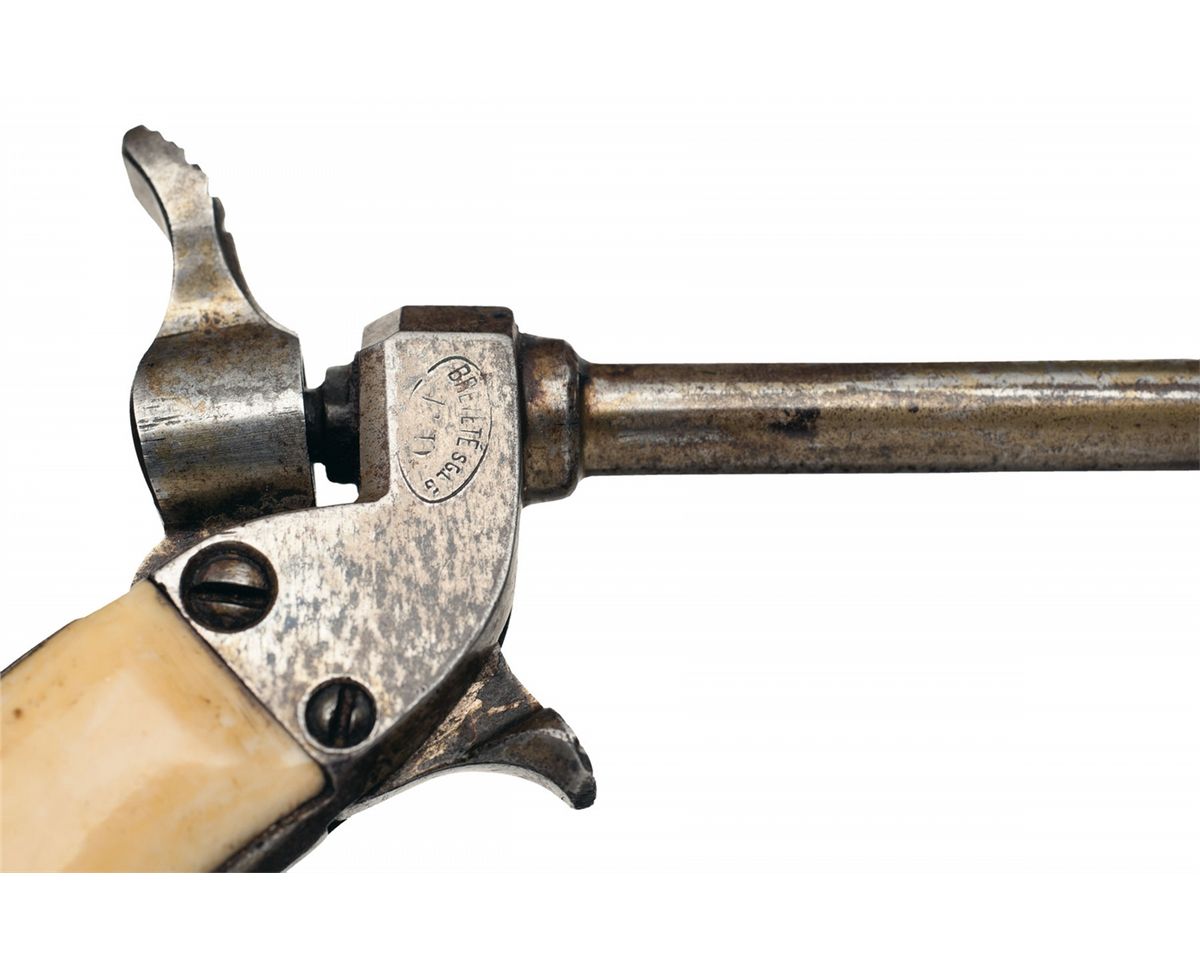 This is an example of an extremely rare percussion combination key/pistol. Measuring 4 1/2" in total length, the underside of the barrel is fitted with a 7/8" long key bit, marked "677" on the left side. Hammer and trigger are checkered, with the right side of the frame near the breech marked "BREVETE SGLG/ ED". Grips are smooth bag shaped ivory.