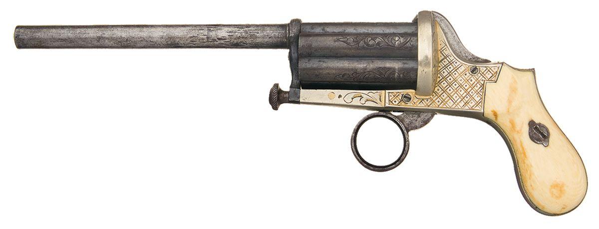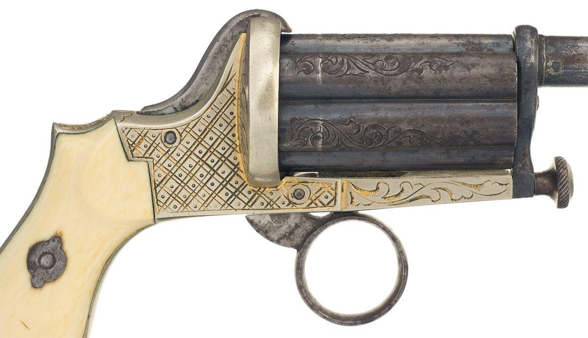 According to Gene Smith and Chris Curtis in THE PINFIRE SYSTEM, the inventor is not known (page 154), but is believed to have originated in Belgium with no makers mark as standard. Can be used as a standard revolver, or, with the barrel removed, as a pepperbox, and has a 6-shot fluted barrel cluster/cylinder with scroll engraving on the chambers. Functions in double action only and has a ring trigger. The German silver frame features a checkerboard pattern engraving with floral engraving under the cylinder, recoil shields and backstrap. Fitted with smooth ivory grips, with the frame exhibiting 95% of the original silver.