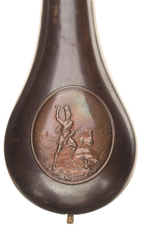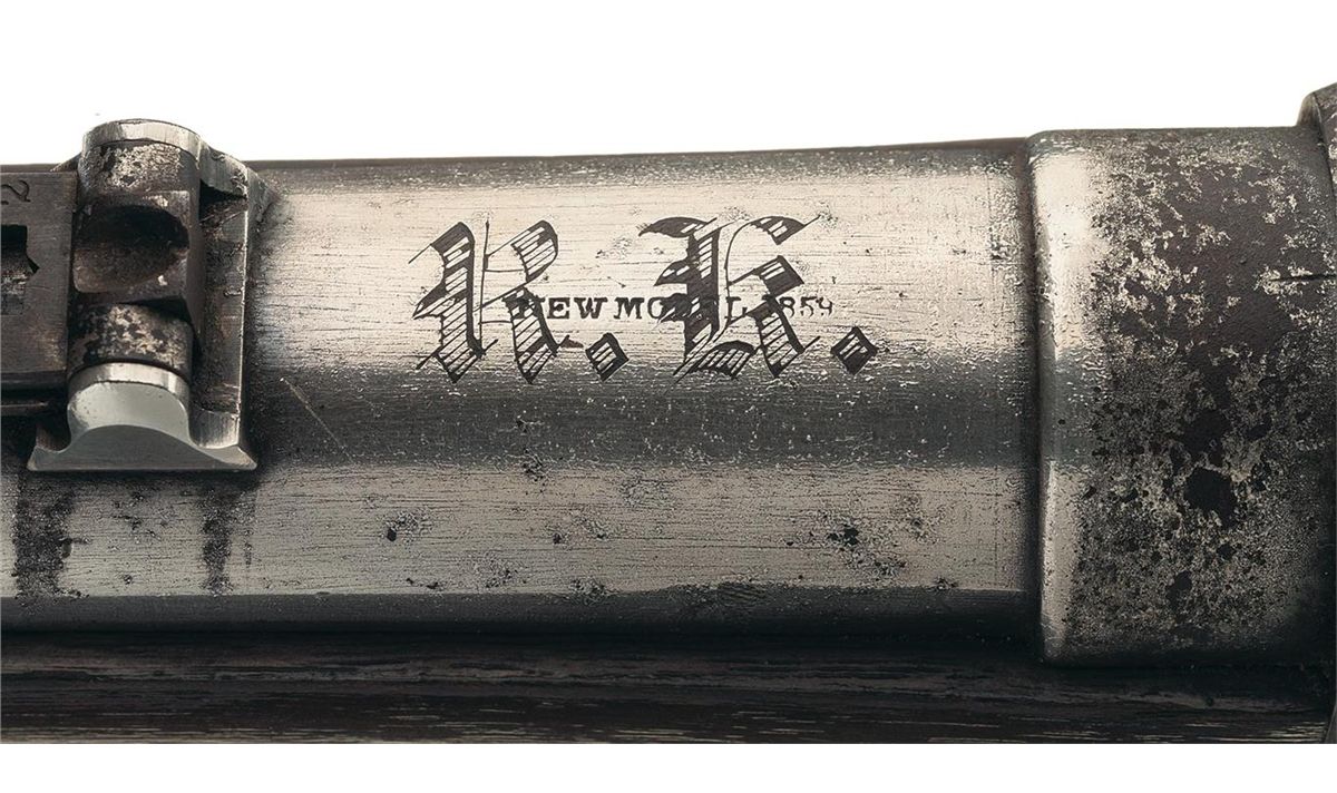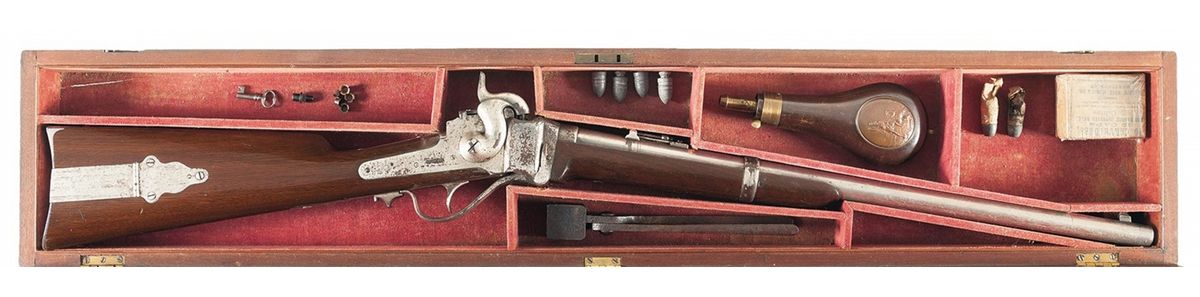 This is unique example of a civilian Sharps New Model of 1859 Carbine manufactured circa 1861. The carbine has a silver plated finish on all components and a varnished straight grain walnut stock and forearm. There are no military inspection or sub-inspection marks on the carbine. The carbine retains the military sling bar and ring and has a complete Lawrence pellet primer. The barrel has a Lawrence patent short leaf folding rear sight with 800 yard center notch. The barrel, rear sight, receiver, and lock plate have the standard Sharps and Lawrence patent markings. The serial number "68930" is stamped on the upper receiver tang. The initials "R.K." are boldly engraved in Old English letters on the top of the barrel over the factory "NEW MODEL 1859" markings. The carbine is equipped with a factory walnut partition case. The case interior has seven compartments and is lined with red baize. The case contain the following: double cavity iron bullet mold marked "NEW MODEL 1866/52" on one leg, adjustable charger powder flask with gold plated top and brown lacquer body embossed with a relief oval hunting scene featuring a hunter, dog and deer, empty original packet of ten 52/100 Sharps cartridges, two original .52 caliber linen cartridges, spare percussion nipple, several lead bullets, several percussion caps and key. None of the accessories are original to the casing. Introduced in 1859, the Sharps New Model 1859 was available as a carbine, military rifle and sporting rifle. The New Model 1859 and its successor the New Model 1863 were quality .52 caliber carbines that were popular among Union Civil War troops. Even the Confederacy manufactured copies of the Sharps carbine in Richmond, Virginia. In actuality Sharps New Model 1859 and New Model 1863 carbines were all one model with the difference in designation being merely a difference in barrel markings, a cleanout screw and minor sight change. 3,000 New Model carbines were manufactured with brass furniture and another 30,000 were manufactured with iron furniture. Silver plated factory examples remained undocumented in SHARPS FIREARMS by noted Sharps expert Frank Sellers, and civilian Sharps New Model carbines are rare given that fact that factory production was devoted to the war effort.