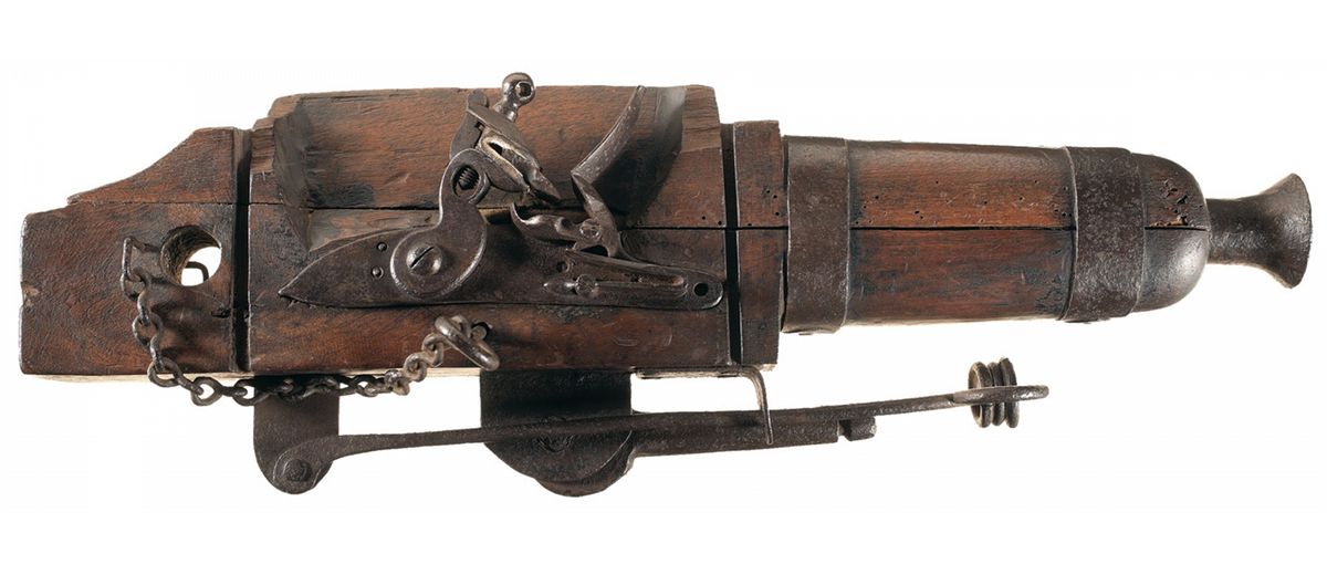 Manufactureded at an unknown time by an unknown party, this flintlock weapon is designed to serve as either a trap or alarm gun. In place of a conventional trigger is a 12 inch pull rod with a swiveling safety and three hanging rings at the end suitable for connection to trip lines, doors, hatches or other objects, and instead of a pistol grip or buttstock there is a swiveling pintle mount on the underside, a bored-through hole behind the lock suitable for suspending the weapon from a line or pole, and a pair of pre-scored grooves ahead and behind the lock suitable for lashing the gun to a stationary object. With a flared muzzle, a pair of heavy barrel bands, an unmarked lockplate and a raised portion of the stock contoured to protect the left side of the hammer and frizzen while not restricting operation.