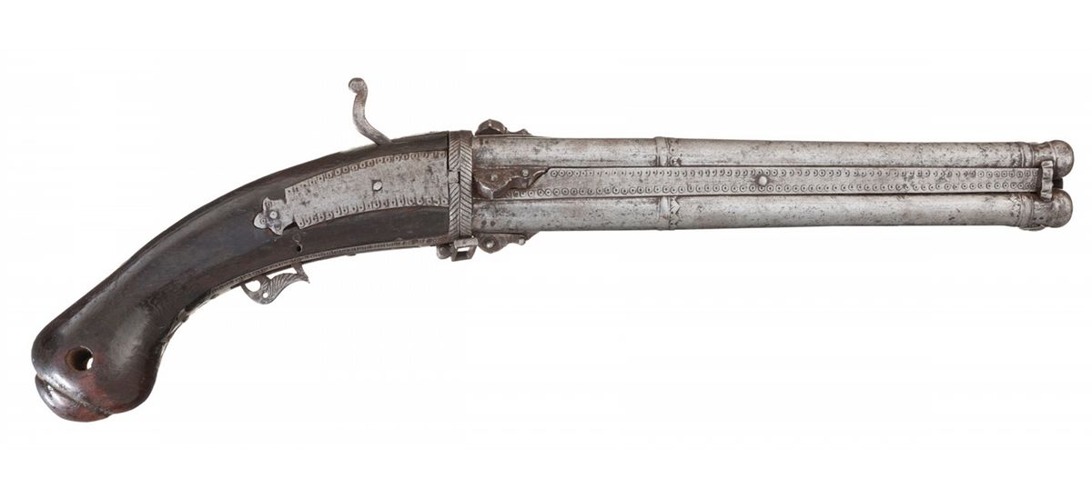 Produced by an unknown maker, this pistol is equipped with a 4-barrel cluster in a square profile, which rotates freely on a center axis. Each barrel has a cannon style muzzle, a pair of raised decorative bands down the length, and an individual flashpan with swiveling cover. Filling the space between each barrel is a metal panel with engraved dot accents. These accents are repeated on the lockplate and tangs, with a cut through leaf design on the skeletonized trigger and a lanyard swivel just behind the barrels. Fitted with a smooth round knob grip, with a drilled-through lanyard hole and a round pommel cap. Provenance: The William Ashby Collection