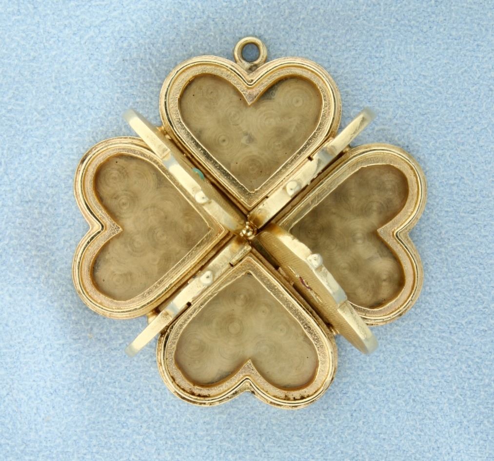 This pendant is 14K yellow gold and contains one .01ct round diamond, one .03ct round ruby, one .03ct round sapphire, & one .03ct round turquoise. The pendant is 1 5/8 inch long. Each heart opens to store pictures or other items. 23.3g