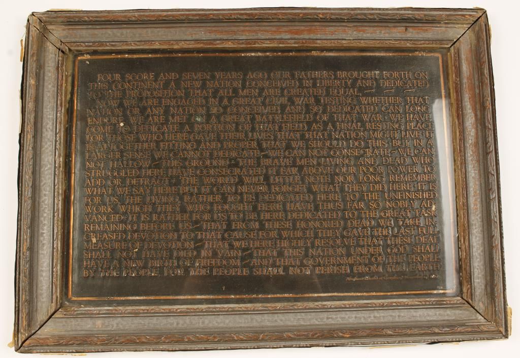 Lincoln at Gettysburg November 1863. Copper embossed with glass front in antique frame.