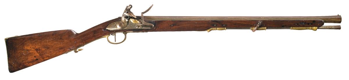This French military flintlock guard gun or quite possibly guard de' corp carbine has a lock plate marked with a small proof over "MRE. IMPLE. / DE VERSAILLES". The carbine has fixed sights on a rifled barrel, brass furniture, brass flash pan, metal ramrod, and sling swivels.
