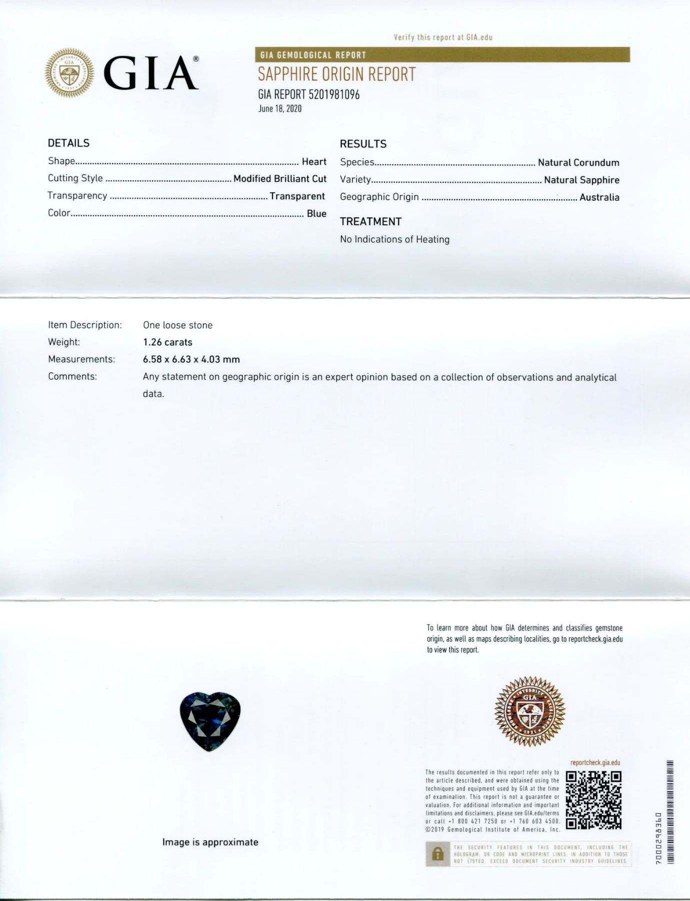Stunning 1.26 Ct Dark Teal-Blue Sapphire measuring 6.58 x 6.63 x 4.03 mm with a brilliant heart cut. Displays a dark tone and saturation. Would make a beautiful centerstone do not miss this! Origin: Australia. Treatment: None. Please see the certification for additional information.