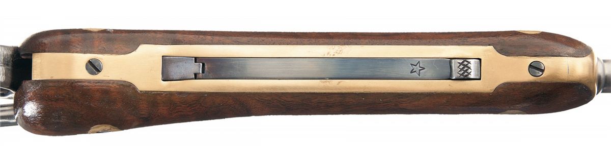 Condition: Fine. The barrel is brightly polished, with traces of blue in the low areas of the cylinder flues and stops, with a dark, water-quenched casehardened finish to the receiver. Bright niter blue is present on the ejector lever and the internal components of the forearm. Stock is very good, with a thin crack on the left side of the forearm, scattered handling marks, and highly attractive grain. Mechanically very good. An attractive example of the gunsmith's art, all but guaranteed to turn heads as part of a display of contemporary or antique arms.