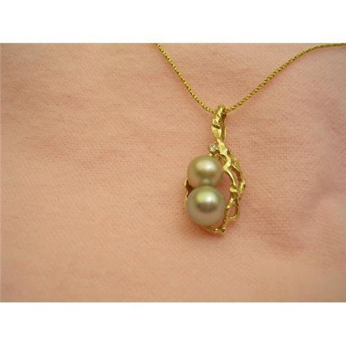 Beautiful Gray Tahitian Pearl Pendant (custom design) with 2 pearls with shades of gray. The darker one is 7mm* and the lighter gray pearl is 6mm. They are set in a free form gold mounting with bail made into the mounting. There is a .02 ct* diamond at the top of the pearls. Weighs 4.4 gm and has a 17" 14k YG fine woven chain (very strong). Pendant is not marked but tests 14K. Chain in marked 14K. Colored pearls are so strong in the fashion world today. This is your chance to find a stylish pendant with two genuine gray pearls. This will become a keepsake to pass down. *all measurements are approximate unless the item comes with an appraisal.