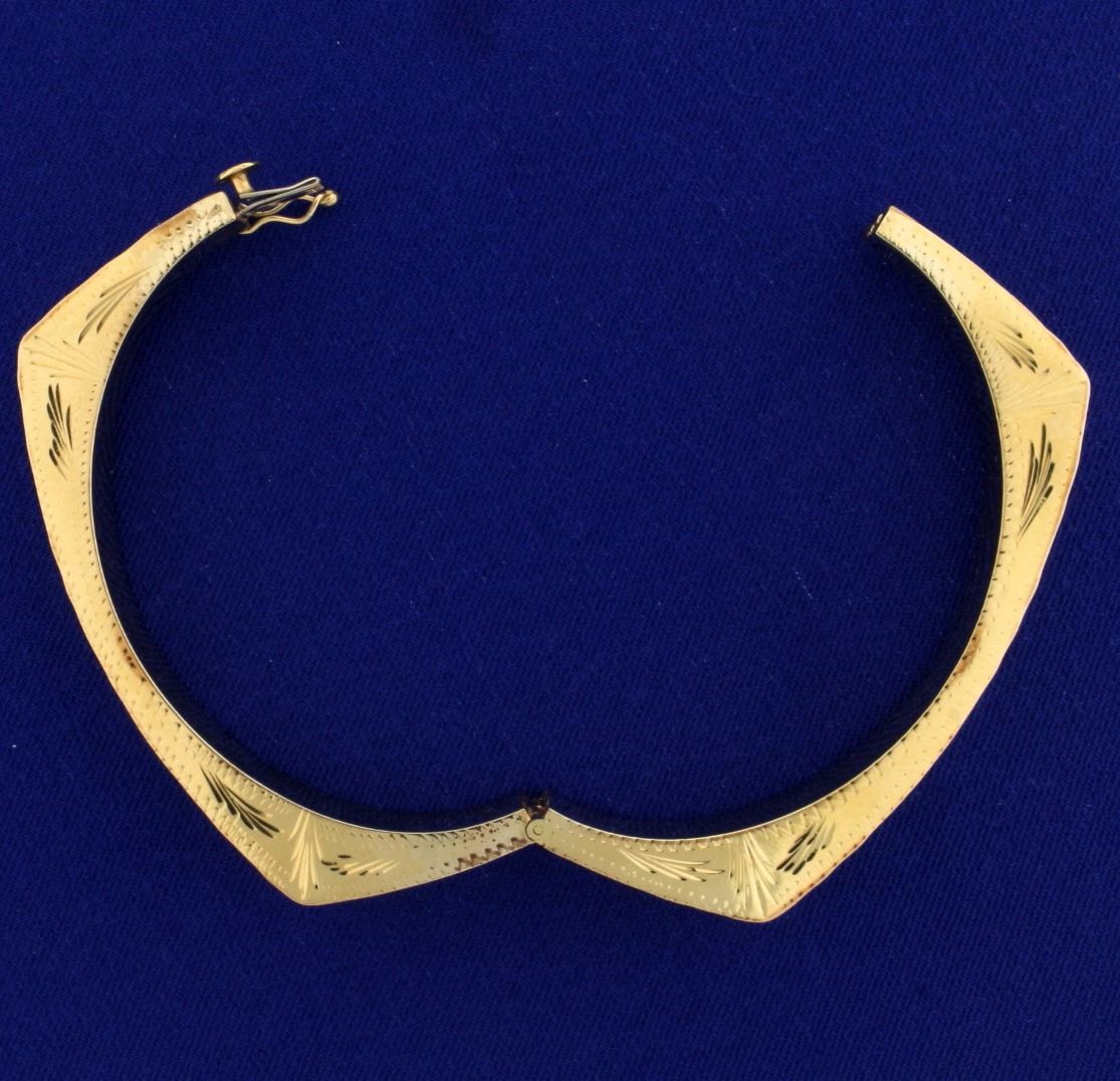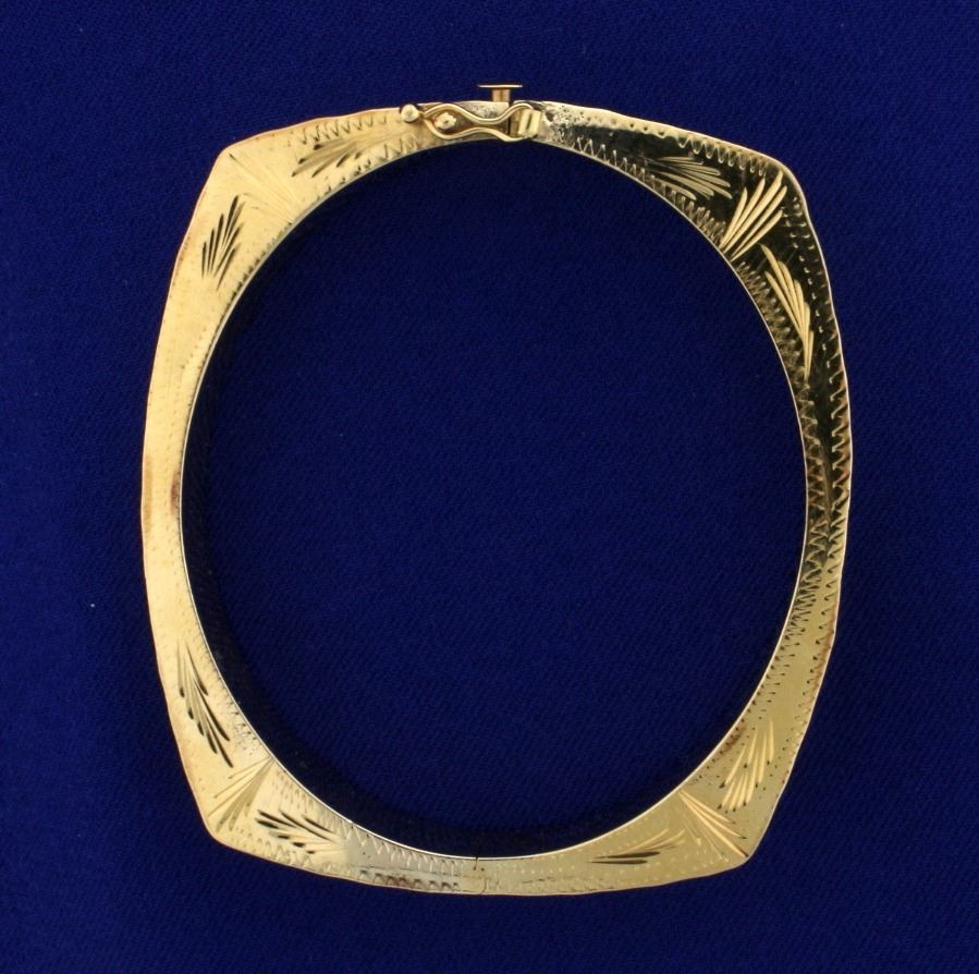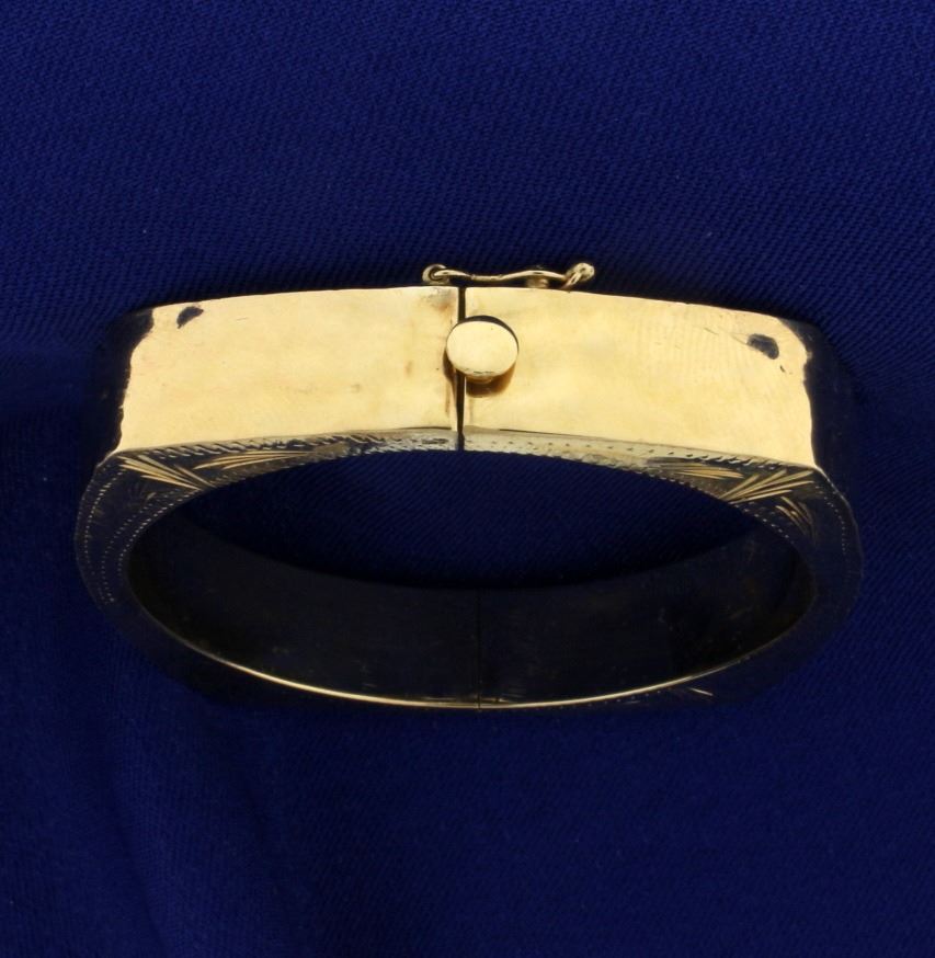 In 14k yellow gold. Hand pounded outside edge with fine detail etched on side. 2 1/4 inch inside diameter, 2 1/2 inch outside diameter, with safety clasp. 21.0g.