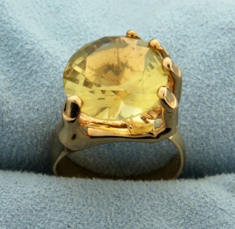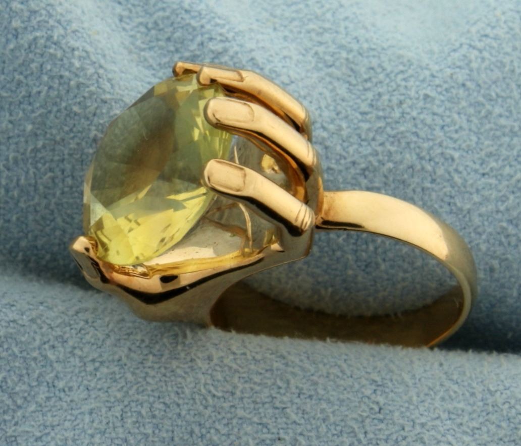 In 14k yellow gold with a custom designed ring. A hand is holding a 7ct citrine gemstone with excellent color and clarity. Size 5 1/2. 10.6g.