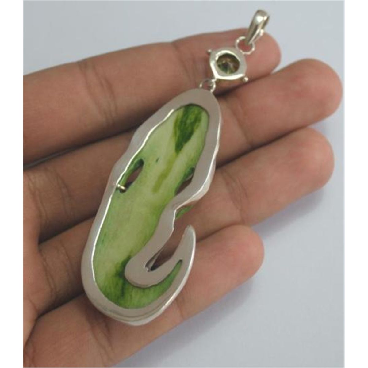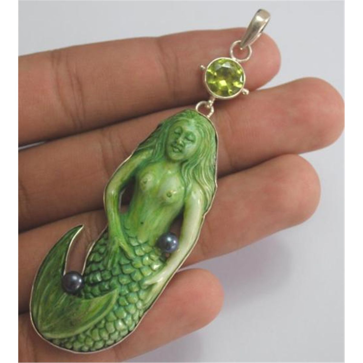 Unique Hand carved Cow bone Mermaid & Peridot Blue Pearl Sterling Silver Pendant, pendant measures approx 3in.