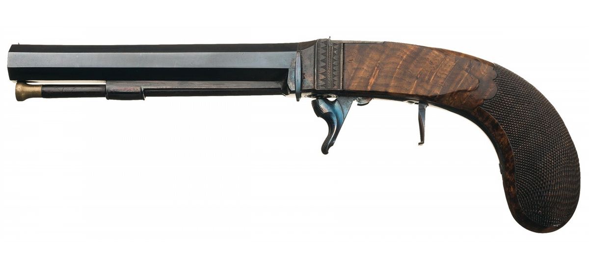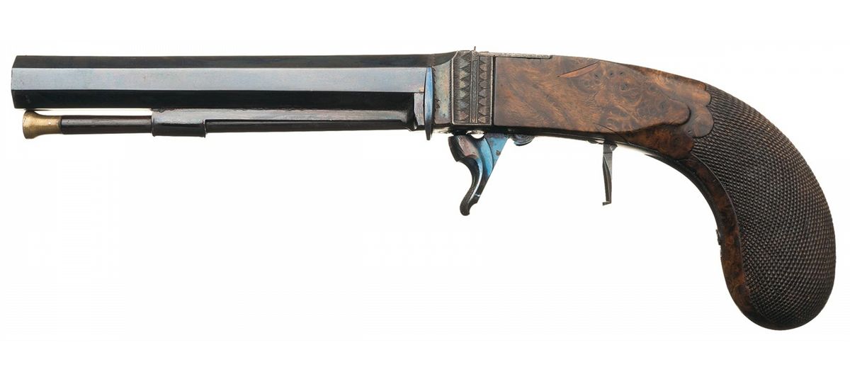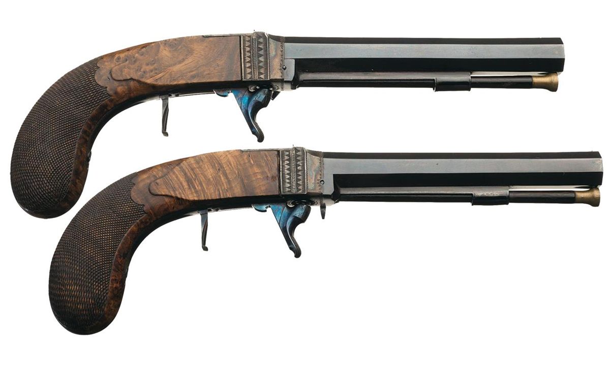 Very fine with 98% plus of the period high polish blue finish on the barrel and the vivid case colors on the receiver and tang. The trigger and hammer have most of the fiery niter blue finish. Traces of very shallow flash pitting are visible on the receiver, barrel and percussion nipples. The grip is excellent with sharp checkering. There is a minor crack directly above the trigger and the edges of the flats behind the lock are slightly rounded. There is a significant gap between the forward edge of the stock and the lock. The action is crisp and functions well. Writer has never seen a pair of this style pistols by this extraordinary maker.