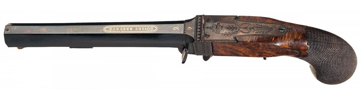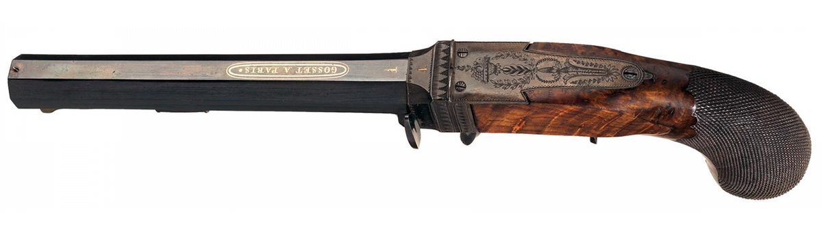 Unique High Grade Matching Pair of Engraved Gold Inlaid French Gosset Underhammer Target Pistols -A) French Gosset Box lock Underhammer Target Pistol