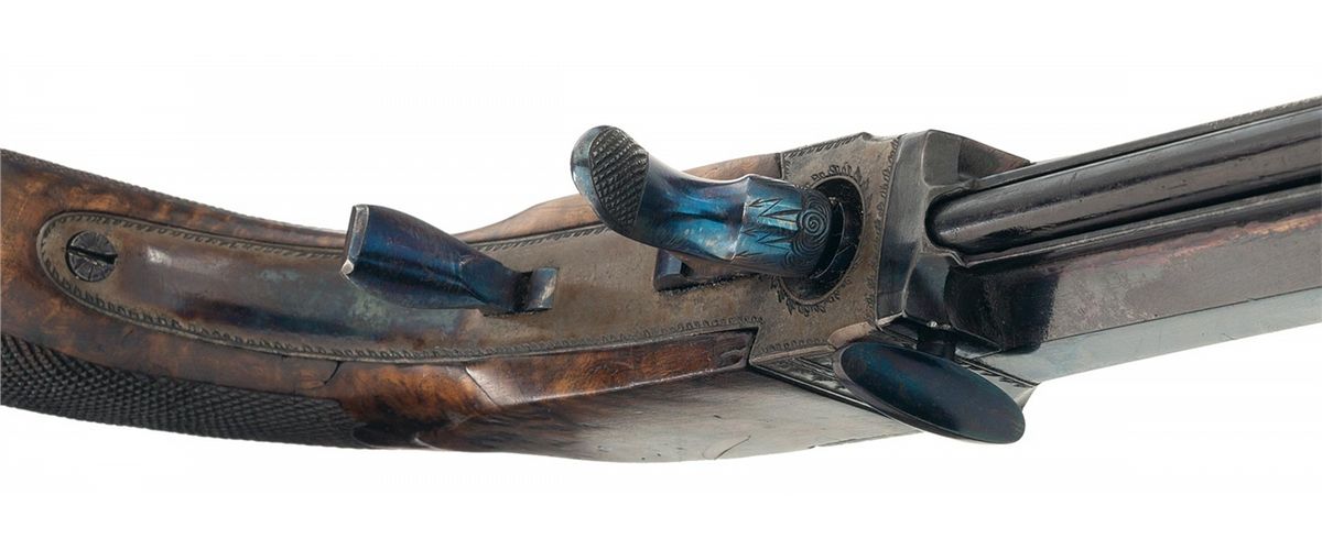 A) These pistols have a steel under lug and single ramrod pipe. The pistol barrels are threaded and secured to the receiver by an oval wing nut on the left side of the receiver. The pistols are fitted with an ebony ramrod with flared brass tip. The barrels have a fine brass pin front sight and a fixed rear sight integral to the receiver tang. The hammer spurs are finely checkered. The triggers fold forward and engage a notch on the hammer to hold it at half-cock. The rear face of each trigger is decorated with fine floral engraving. The top of each barrel is gold inlaid with either "GOSSET A PARIS" or "GOSSET BREVETE" surrounded by two oval rings. The individual pistol number "1" OR "2" is inlaid in gold on the barrel and receiver. The pistols have a high polish blue finish on the barrels casehardened locks and niter blue hammers and triggers. The stocks are highly figured European walnut with finely cut borderless checkering on the grips and an oil finish. The edges of the lock and upper tang are decorated with delicate Boutet quality floral pattern engraving.