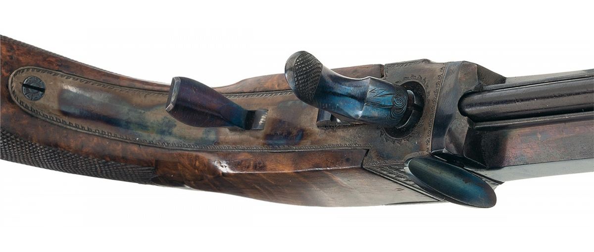 Very fine with 98% plus of the high polish blue finish on the barrel and the vivid case colors on the receiver and tang. The trigger and hammer have 98% of the fiery niter blue finish. Traces of very shallow flash pitting are visible on the receiver, barrel and percussion nipple. The fine rifling is sharp but has some traces of pitting. The grip is excellent with sharp checkering and the edges of the flats behind the lock are slightly rounded. There is evidence of shrinkage between the forward edge of the stock and the lock. The action is crisp and functions well. This is a very attractive brace of high grade 19th Century French underhammer target pistols made by a famous Paris Gunmaker.