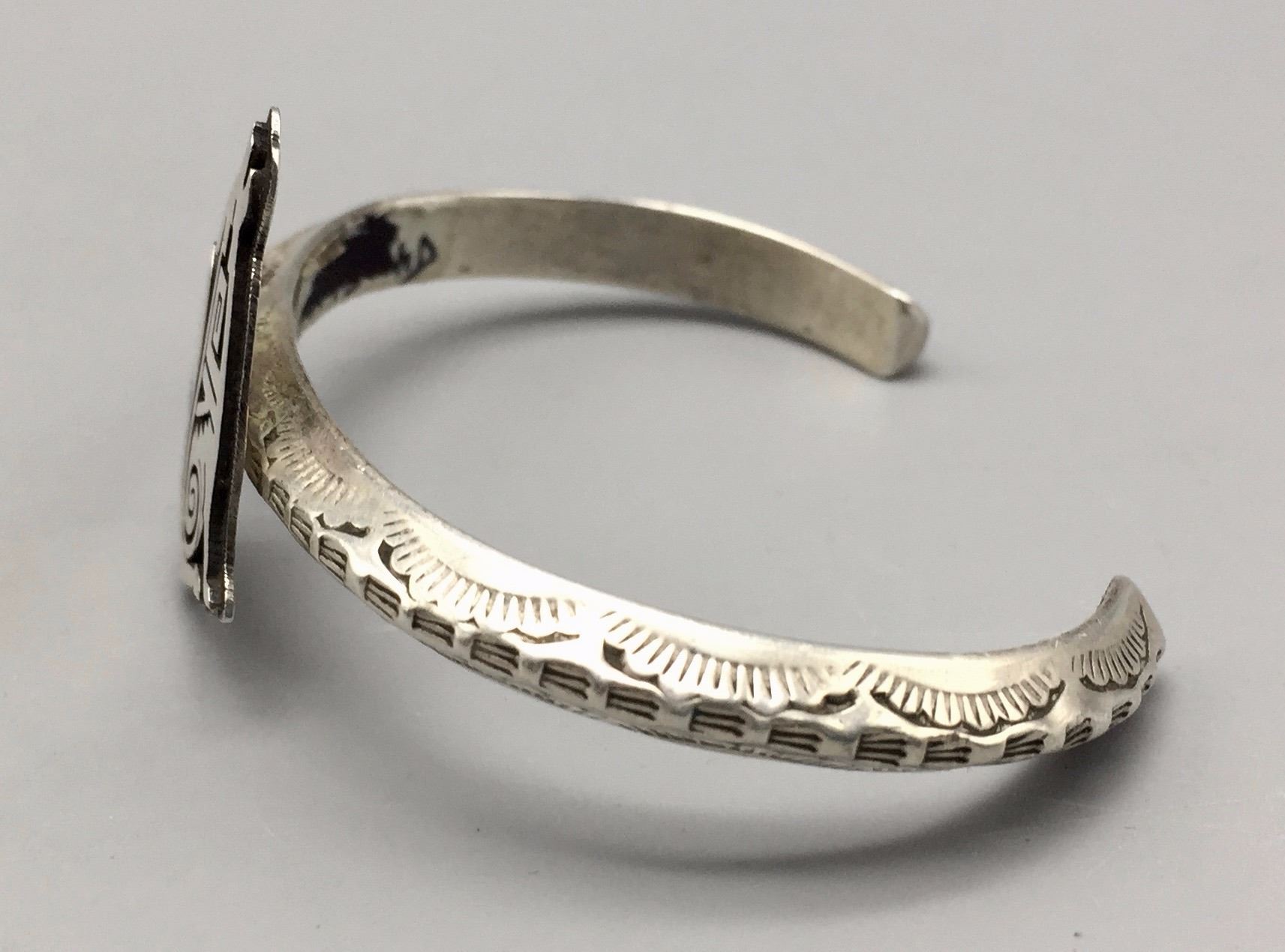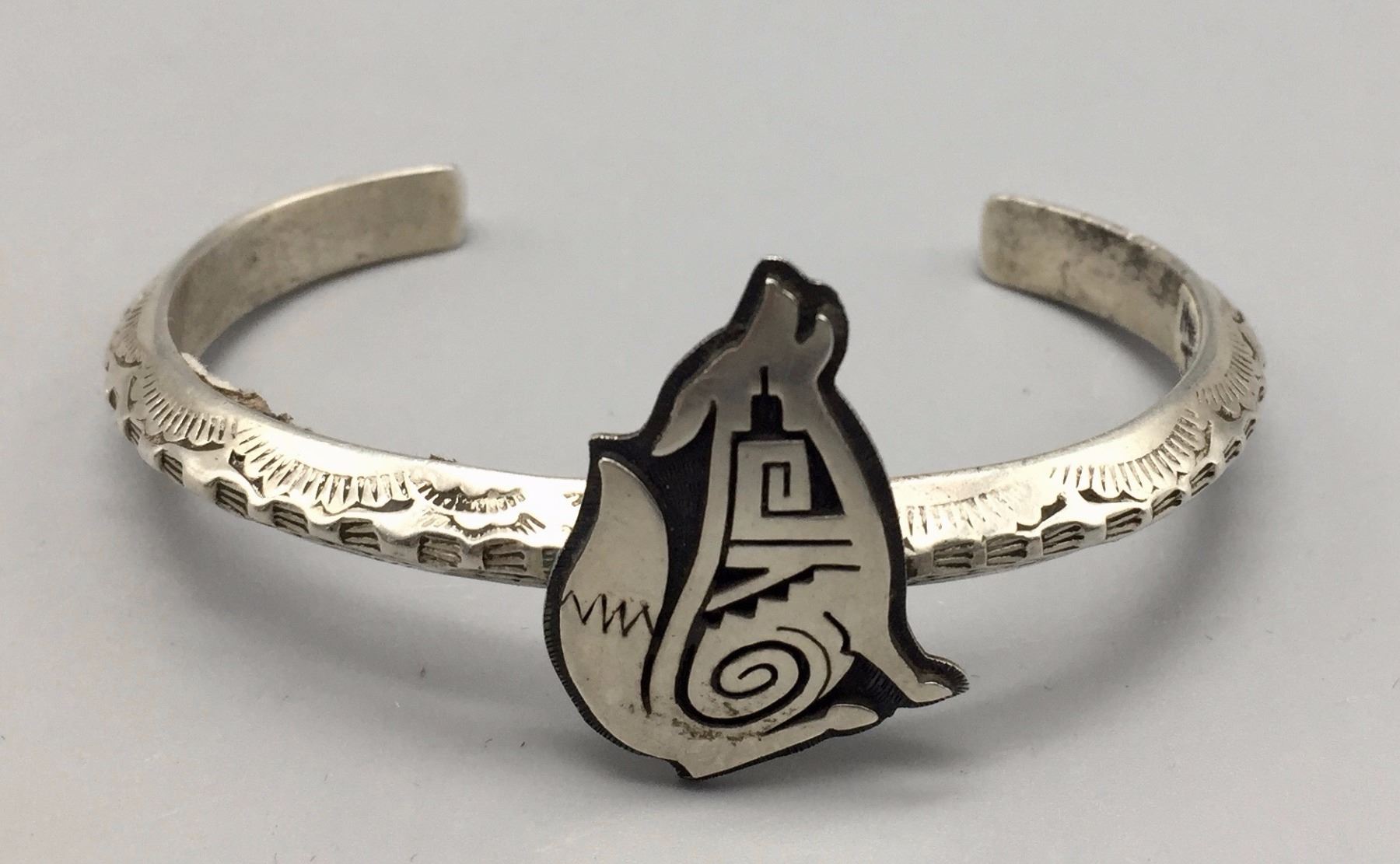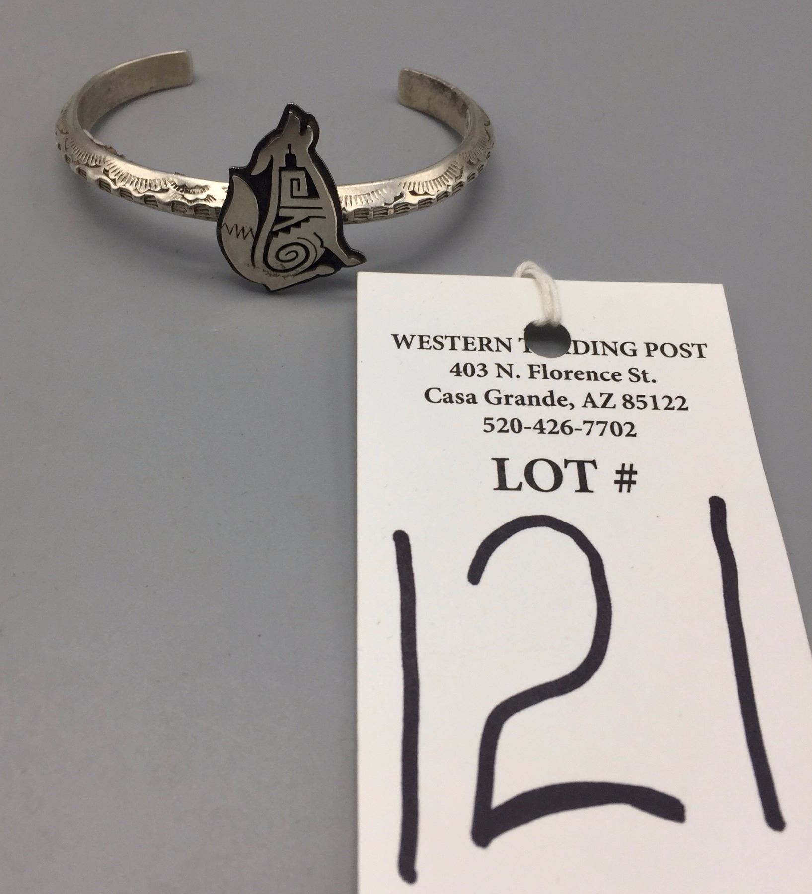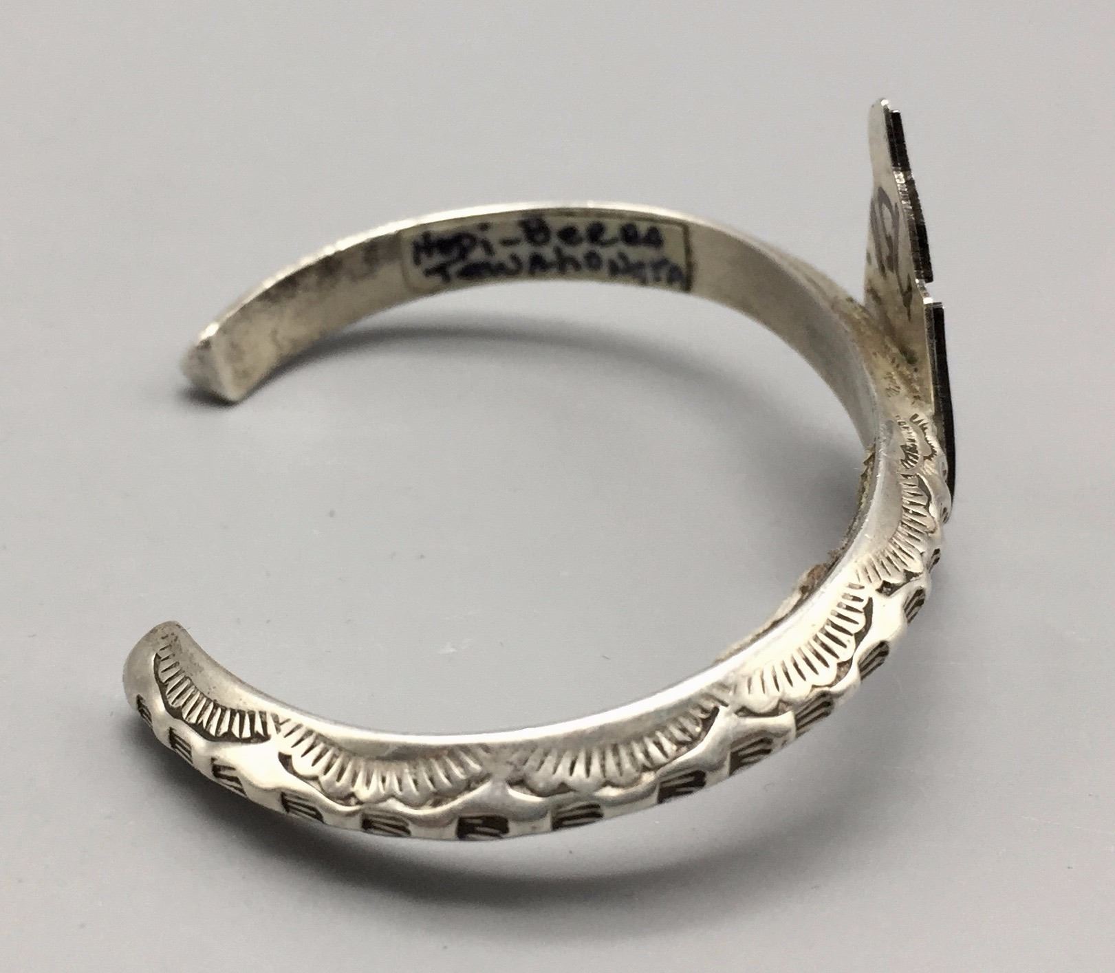 Maker: Hallmarked BT (etched, conjoined) Berra Tawahongva, Hopi. Approx. Age: Vintage (Circa 1980’s) Size: Inside circumference of bracelet is 5 1/8” plus it has a 1 3/8” opening (making it fit a 6 1/2” wrist). Bracelet is 1 1/4” at it’s widest point and weighs 27.0 g. Additional Info: Unique coyote overlay style bracelet. Condition: Good, normal wear expected. Please look closely at the pictures - they are an important part of our description. Shipping: There will be a $5 handling / packaging fee for shipping this lot. The actual cost of postage will be added on top of that.