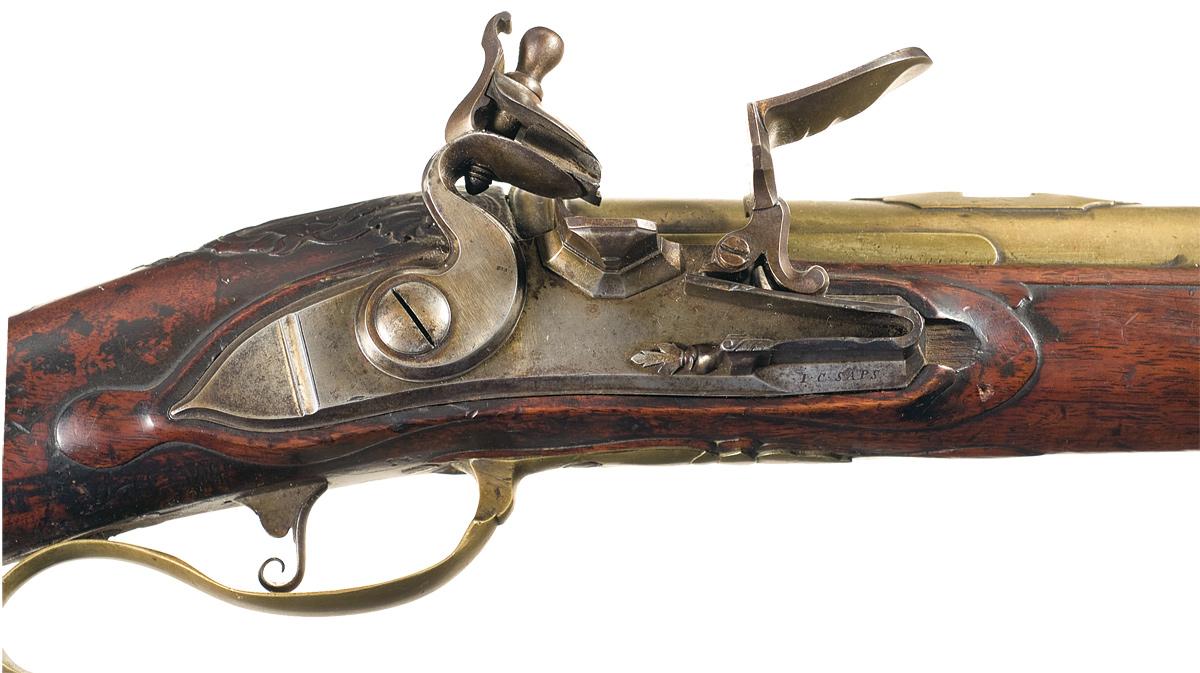The front of the lock plate is marked "A Berlin" above the frizzen spring and "I.C. SAPS" below the spring. The lock plate, hammer, pan, frizzen, and frizzen spring are iron, with the remaining components (including the barrel) brass. Blade front sight with the rear sight having been removed on a barrel that has been sleeved to a much smaller caliber. The area outside of this is the air jacket to store the compressed air. There is a gas relief valve under the barrel, which is tripped by an auxiliary lever inside the lock to activate the gas release, thus propelling the projectile (from the outside, the only clue to this not being a flintlock is the lack of a touch hole for powder ignition!). A 12 1/2" retractable iron rod (within an air piston) has been added to the butt. Full length stock with relief carvings flanking the cheekpiece and around the upper tang. A hollow brass tube has been inserted on the right side of the buttstock (reason unknown).