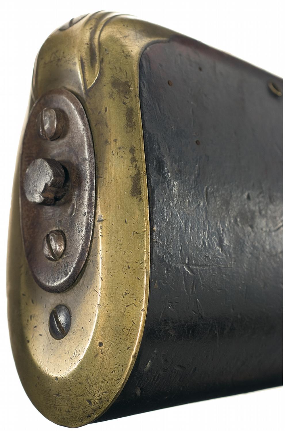 Condition: Fine. The brass has an even aged patina. The action has a mixed gray patina with some pin point pitting. The stock is fine with a chip missing from around the lock and a few minor cracks on the forearm which has a few missing slivers of wood, along with some minor dings and scratches overall.