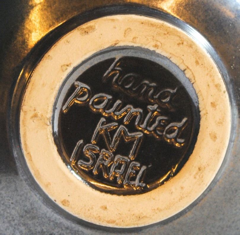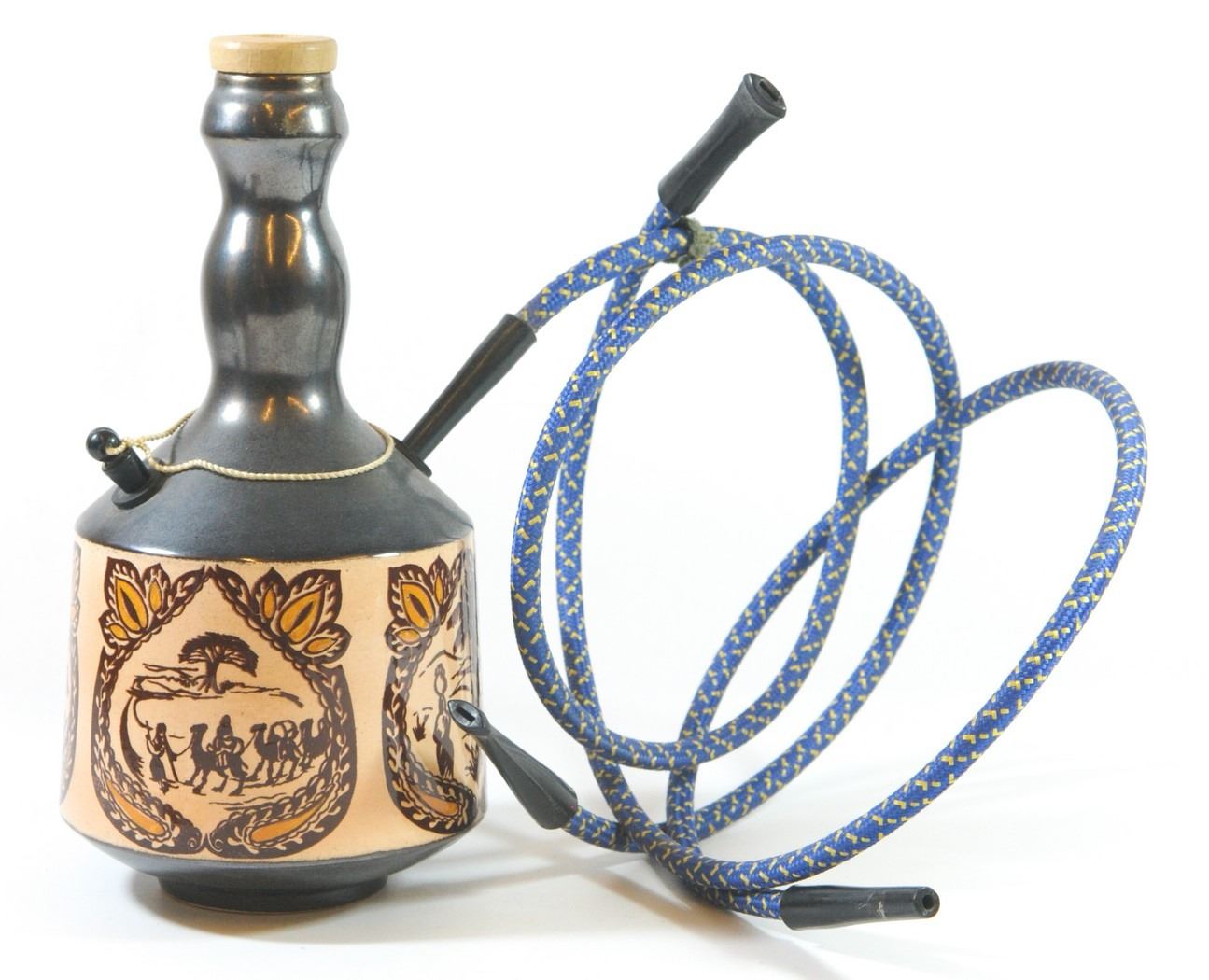 Unique! Israeli ceramic hooka made in Kfar Menachem, embellished with prints of figures against the background of old Eretz Israel landscapes, including original mouthpiece, height: 24 cm.