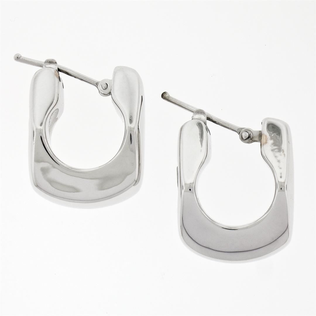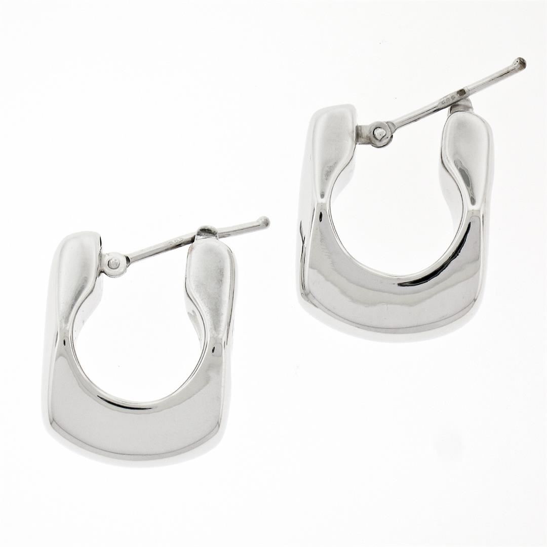 A new solid 14k white gold unique italian puffed snap huggie earrings. The earrings measure approximately 19.45x9.30mm and weigh a total of 3.77 grams.