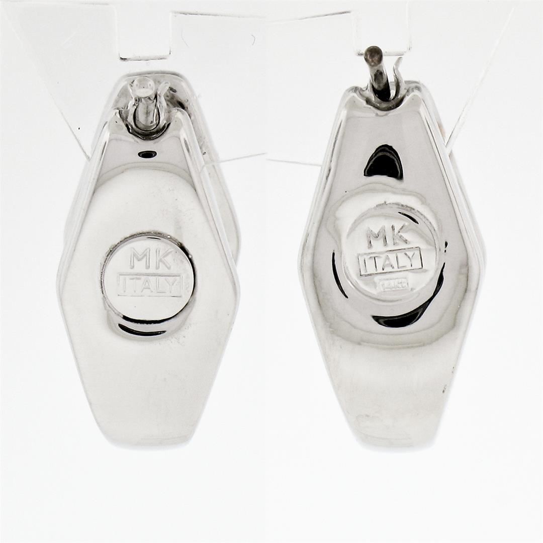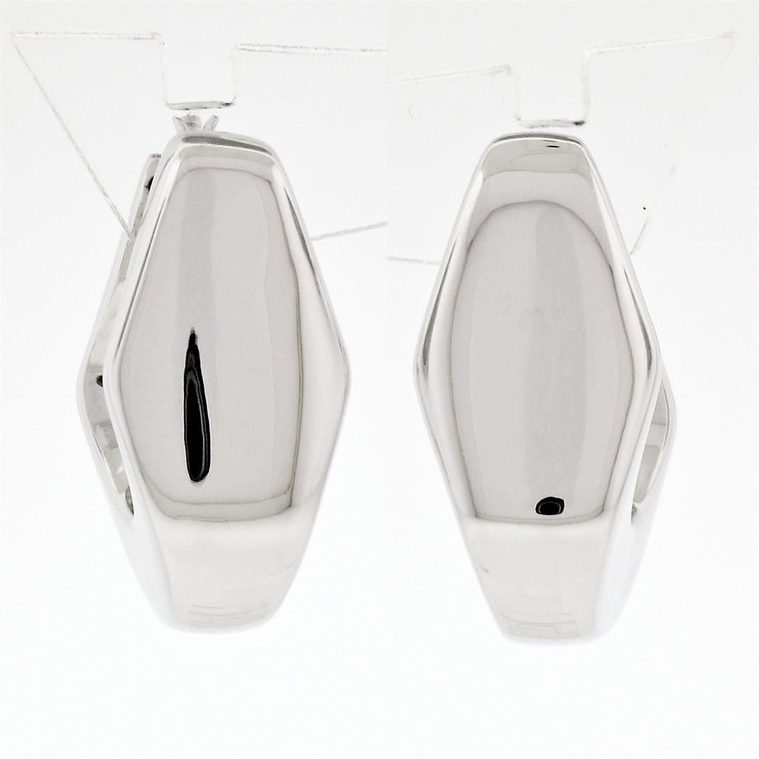 A new solid 14k white gold unique italian puffed snap huggie earrings. The earrings measure approximately 19.45x9.30mm and weigh a total of 3.77 grams.