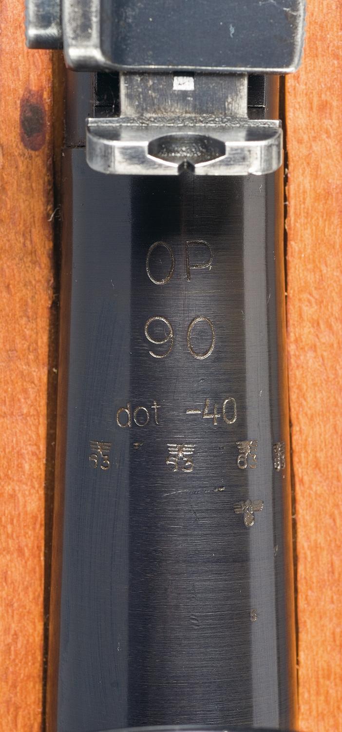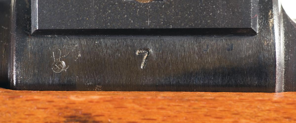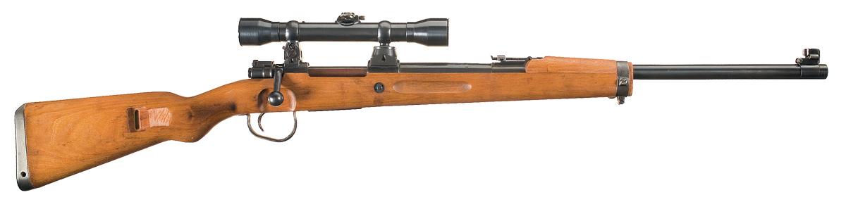 This is another beautiful example of a prototype K98 style heavy barreled sniper rifle "Serial Number 7". This rifle is almost identical to the "Long Side" rifle that is also offered in this auction, except it was built using the turret type sniper set up. The rifle was assembled using an early wartime K98 Mauser receiver only this version was fitted with a set of low turret sniper mounts. These turret style sniper rifles were one of the most used and best handling German sniper rifle produced during WWI. However they also proved to be one of the most time consuming and difficult to manufacture. The top of the receiver is covered by the front turret base, however, we can see the lower portion of two small Mauser eagle 63 proofs on the right side just below the base and the receiver side wall has the standard "MOD 98" markings. The left side of the receiver has the remnants of the original German Eagle firing proof along with serial number "7". As noted the receiver has the correct low turret scope bases, and rings, all of which are unmarked or proofed. With a early Hensoldt-Dialytan scope. The side of the scope is marked; "HENSOLDT-WETZLAR/DIALYTAN 4X Nr.726, and it has a taper post and cross-hair reticule similar to that used in the US M82 and M84 scopes. The top elevation knob is correctly marked with a range scale, from 0-50, which we assume would corresponds to 0-500 meters. The two most intriguing features of this rifle, like the long side rail offered in this auction, is that it is fitted with a heavy target type sniper barrel with a new factory (not cut down) half length hardwood (beech) stock and handguard. The stock and handguard are both stamped with serial number "7" and the stock is identical to the late war version that lack the bolt take down washer and also has the late wartime cupped buttplate, with the take down hole in the lower left hand side. This style of half-stock is very similar to the many of the current match or target type stock used today. The shorter style stock and handguard did away with all the front bedding problems and additional parts associated with the full length stock. The fore stock extends to approximately 5 inches in front of the rear sight base the corresponding handguard is approximately 5 3/4 inches in length that goes from the middle of the rear sight base to the end of the foreshock. Both foreshock and handguard are retained with a VZ24 style barrel band with the side mounted sling swivel. This style of barrel band provided the necessary tension to the foreshock and handguard to dampen barrel vibrations. The barrel is very similar to in size to the early MG-34 barrel diameter and configuration, that is approximately 23 inch long and has the standard four lands and groove rifling. The outside diameter measures approximately 1 inch at the front of the receiver tapers down to approximately 7/8 at the rear sight base and then tapers down to approximately 3/4 of an inch at the muzzle. The rear sight and base are from a Czech G33/40 carbine with the short tangent with the locking screw in front of the base. The leaf is correctly graduated from 100-1000 meters. The barrel is fitted with a machined prototype K98 style front sight that consists of a machined front sight base that is mounted on a semi-circle round barrel band that has been soldered on the to barrel, that has also been fitted with a Czechoslovakian front sight protector. The top of the barrel behind the rear sight base is marked "OP/90/dot-40" with four "eagle 63" proofmarks over a small single WWII German eagle firing proof. The lower left side of the barrel (below the stock line) is also marked with "S/4656/3". The "dot" markings are the wartime code for the Waffenwerke factory at Bruno, Czechoslovakia. The rifle is fitted with a late war, unmarked Czech, large trigger guard stamped box magazine, trigger guard assembly and the bolt is an earlier style that has the single guide rib with the enlarged gas holes with a standard bolt shroud, safety and cocking knob.