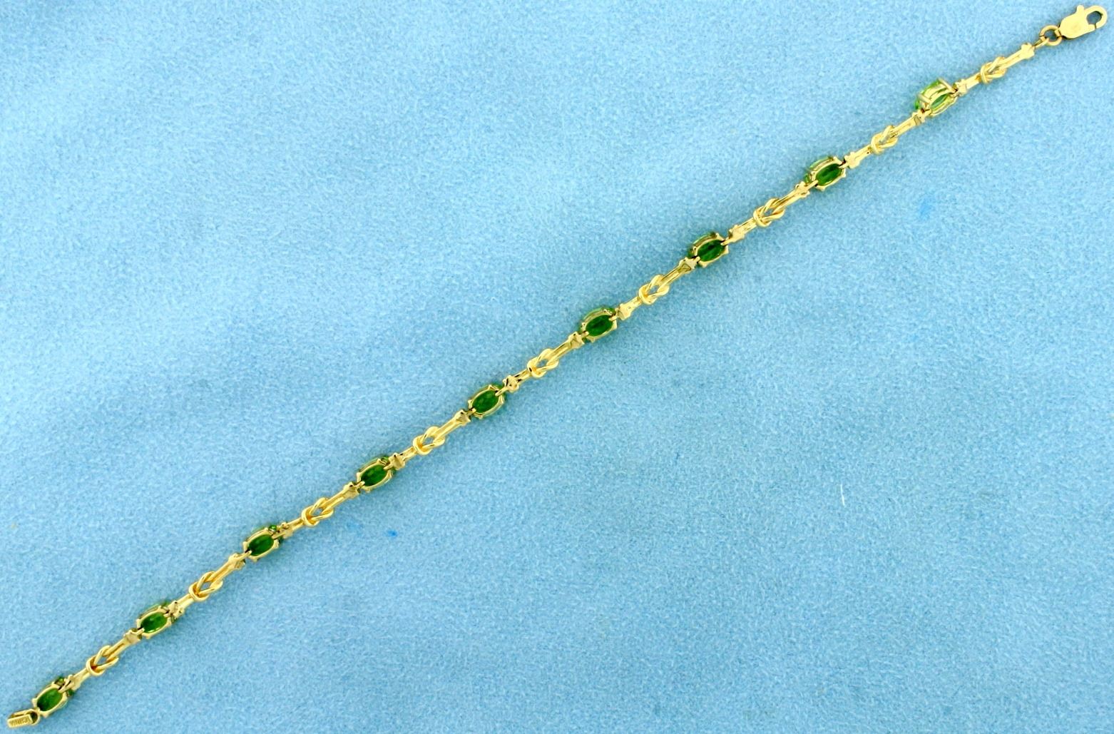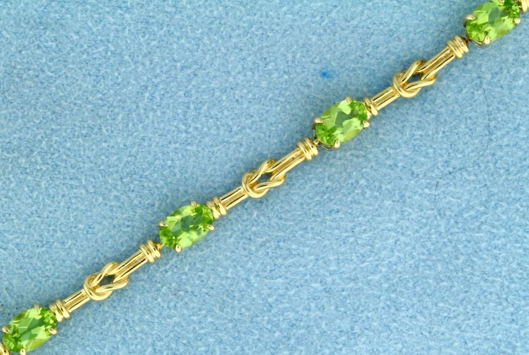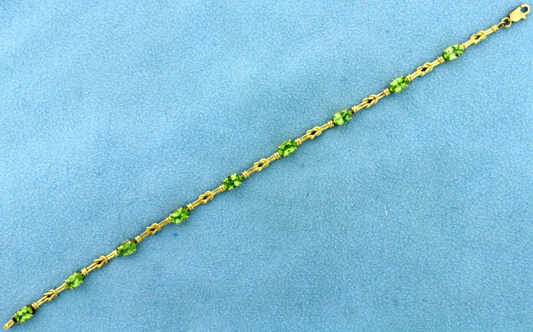 In 10K Yellow Gold. 7 1/2" long, with lobster clasp. Contains nine natural 6x4mm peridot gemstones with bright color and excellent clarity. 5.4g